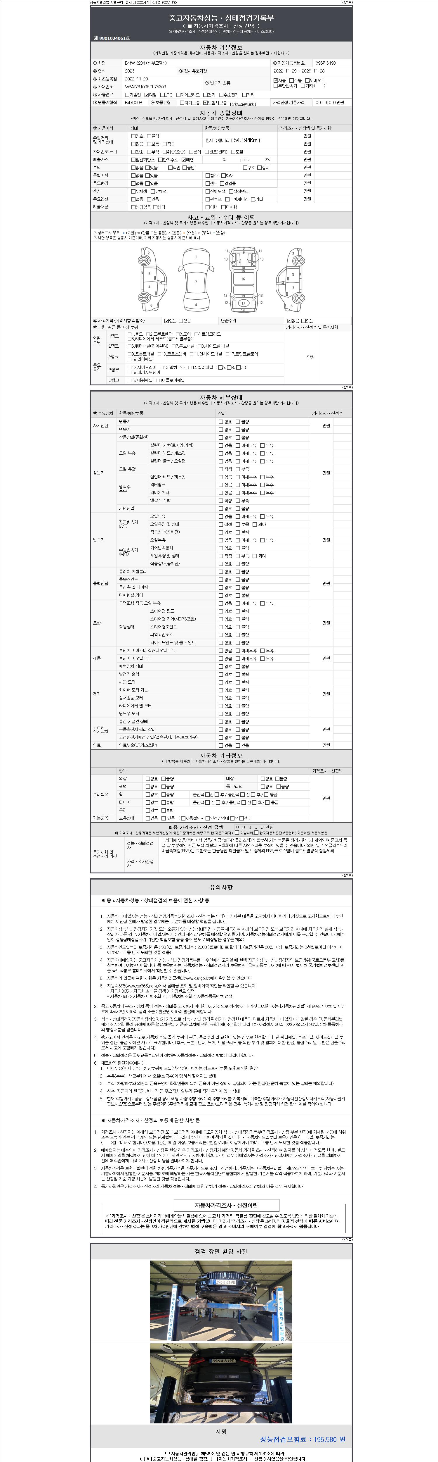 자동차관리법 시행규칙 제120조의 규정에 따라 별지 제 82호서식 《중고자동차 성능, 상태점검 기록부》를 발행한 성능, 상태점검자 및 매매자는 아래의 보증기간 또는 보증거리 이내의 중고자동차, 성능점검 기록부에 기재된 내용과 자동차의 실제 성능, 상태가 다른 경우 계약 또는 관계법령에 따라 매수인에 대하여 책임을 집니다.
