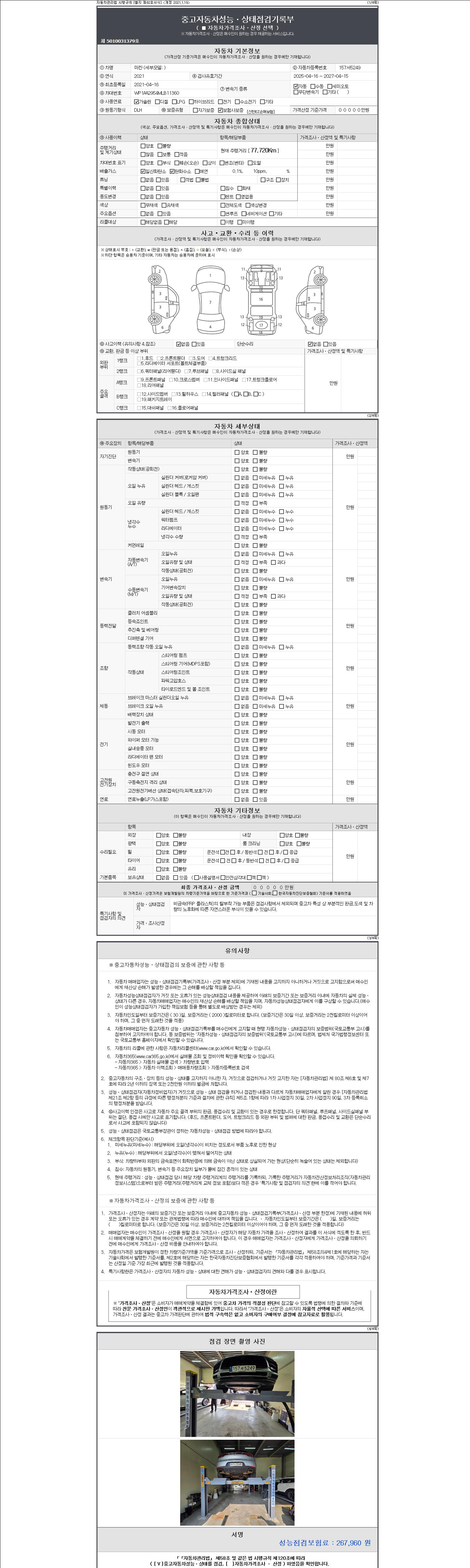 -중고자동차 매매업자를 통해 차량을 구입하실 경우 반드시 "중고자동차 성능, 상태점검 기록부"를 교뷰 받으셔야 하며, 매매업자는 반드시 의무 교부 하여야 압니다.