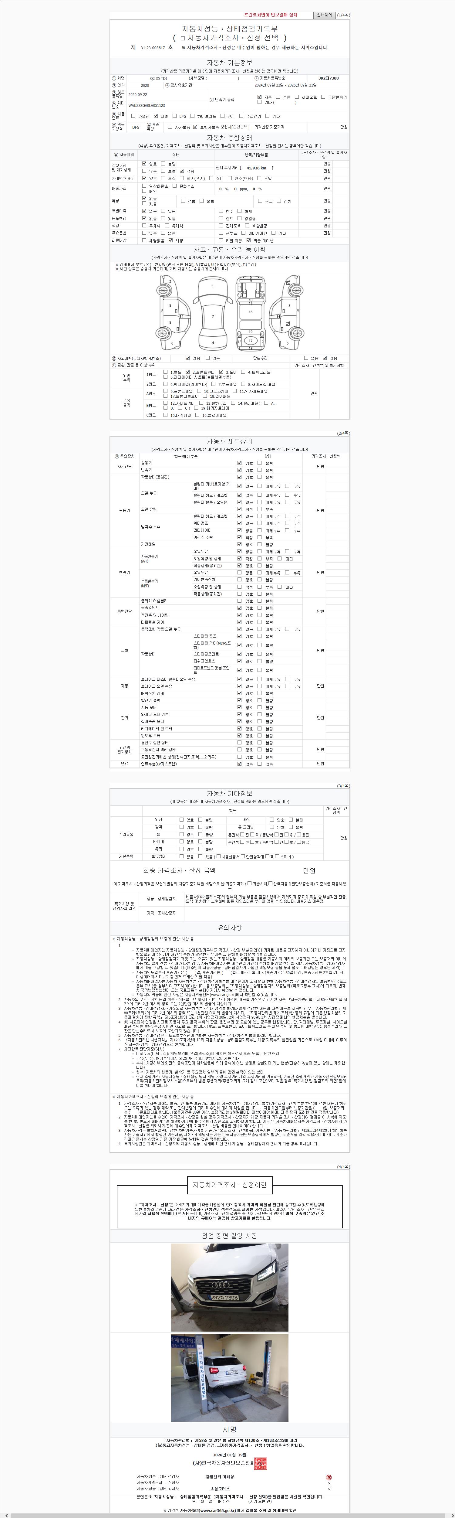 | 주행거리 | 45,926 km | 차량번호 | 392다7308 |