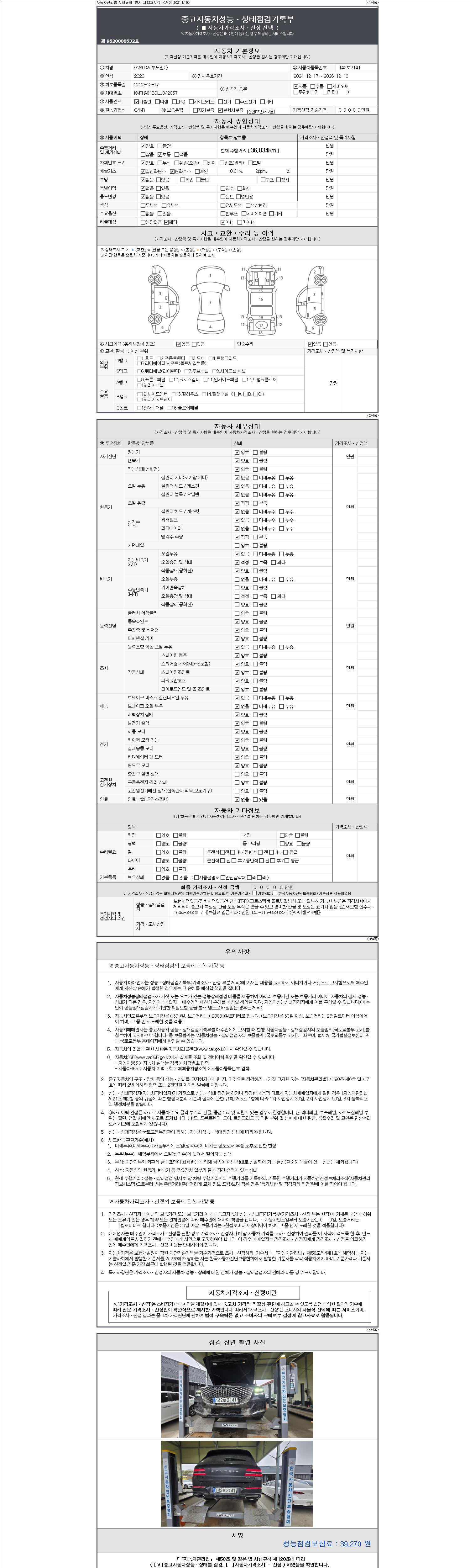 자동차관리법 시행규칙 제120조의 규정에 따라 별지 제 82호서식 《중고자동차 성능, 상태점검 기록부》를 발행한 성능, 상태점검자 및 매매자는 아래의 보증기간 또는 보증거리 이내의 중고자동차, 성능점검 기록부에 기재된 내용과 자동차의 실제 성능, 상태가 다른 경우 계약 또는 관계법령에 따라 매수인에 대하여 책임을 집니다.