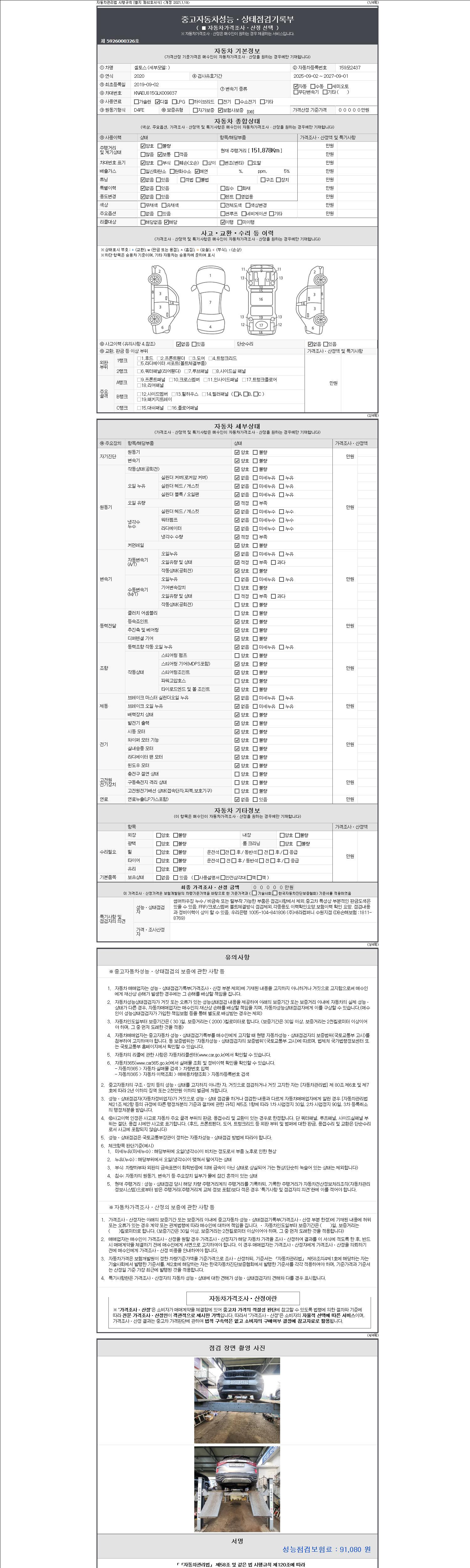 자동차관리법 시행규칙 제120조의 규정에 따라 별지 제 82호서식 《중고자동차 성능, 상태점검 기록부》를 발행한 성능, 상태점검자 및 매매자는 아래의 보증기간 또는 보증거리 이내의 중고자동차, 성능점검 기록부에 기재된 내용과 자동차의 실제 성능, 상태가 다른 경우 계약 또는 관계법령에 따라 매수인에 대하여 책임을 집니다.