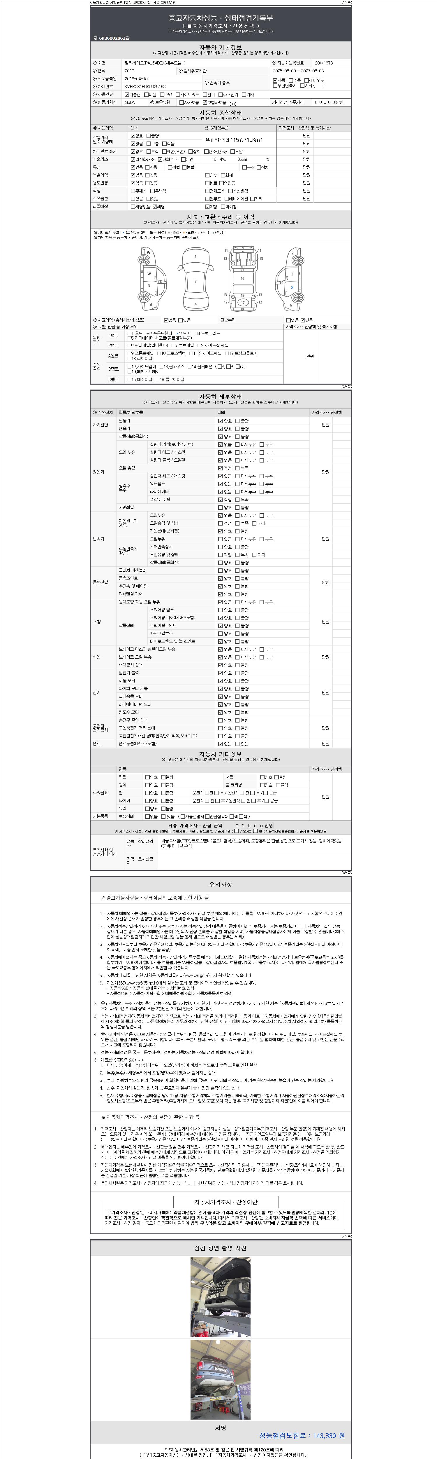 자동차관리법 시행규칙 제120조의 규정에 따라 별지 제 82호서식 《중고자동차 성능, 상태점검 기록부》를 발행한 성능, 상태점검자 및 매매자는 아래의 보증기간 또는 보증거리 이내의 중고자동차, 성능점검 기록부에 기재된 내용과 자동차의 실제 성능, 상태가 다른 경우 계약 또는 관계법령에 따라 매수인에 대하여 책임을 집니다.
