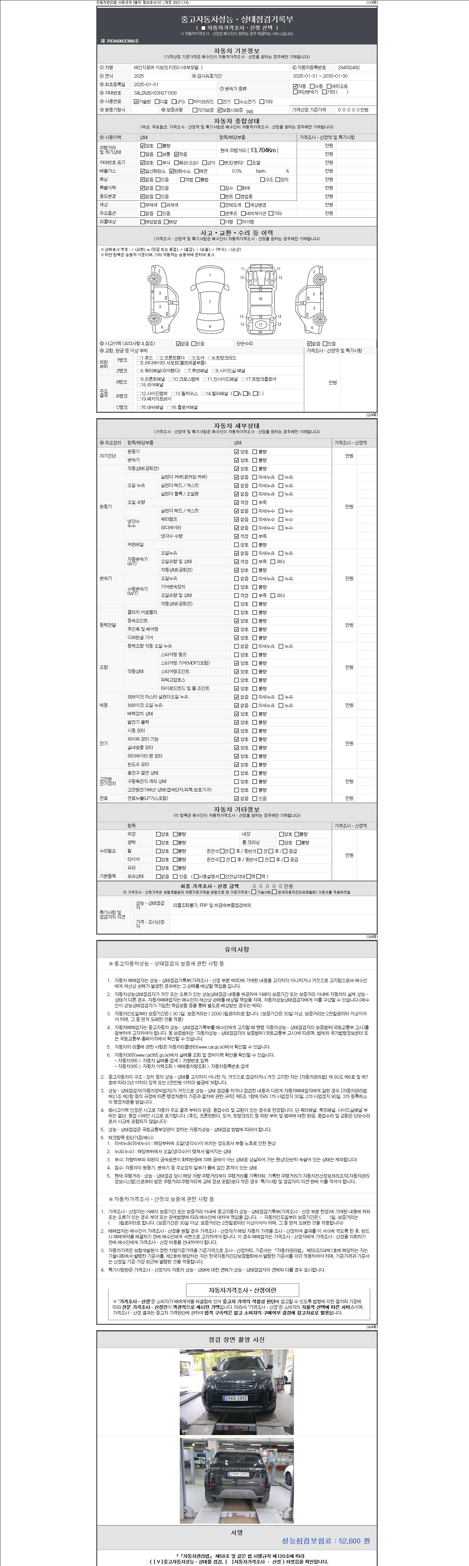 자동차관리법 시행규칙 제120조의 규정에 따라 별지 제 82호서식 《중고자동차 성능, 상태점검 기록부》를 발행한 성능, 상태점검자 및 매매자는 아래의 보증기간 또는 보증거리 이내의 중고자동차, 성능점검 기록부에 기재된 내용과 자동차의 실제 성능, 상태가 다른 경우 계약 또는 관계법령에 따라 매수인에 대하여 책임을 집니다.