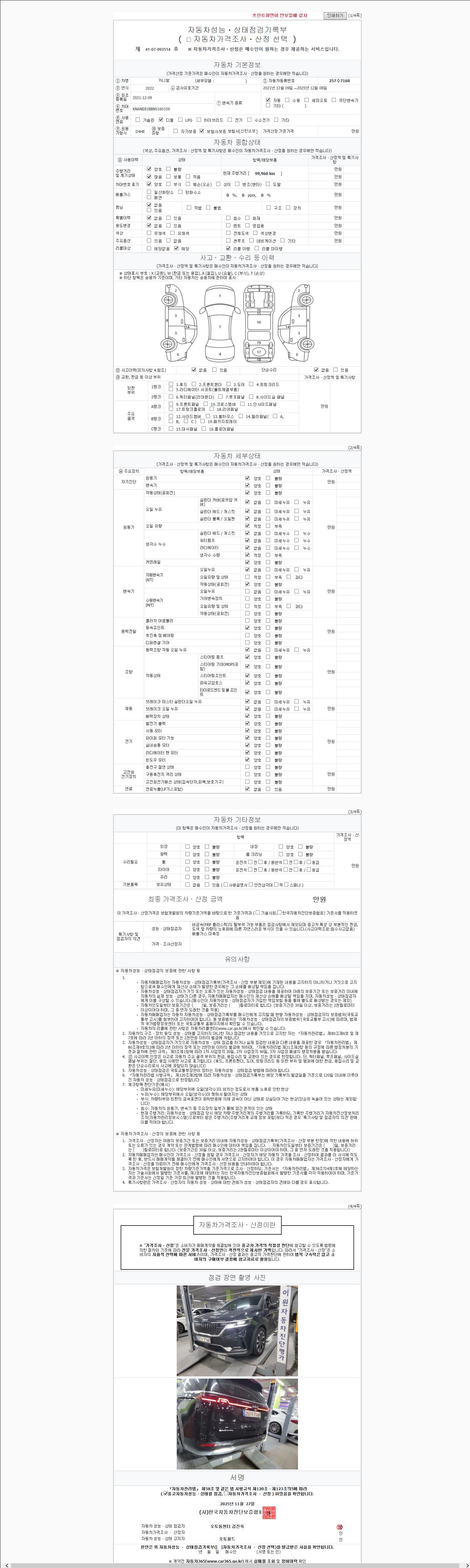 | 주행거리 | 99,960 km | 차량번호 | 257수7168 | 사고유무 | 성능기록부 참조 | 제시번호 | 제 2147483647 호 |