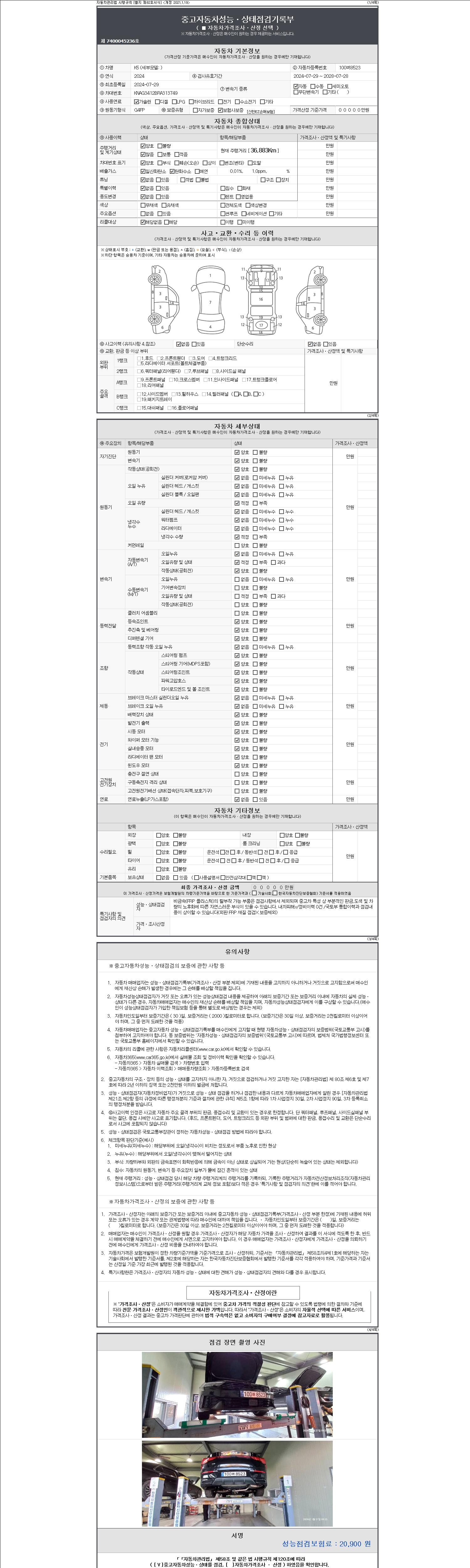 자동차관리법 시행규칙 제120조의 규정에 따라 별지 제 82호서식 《중고자동차 성능, 상태점검 기록부》를 발행한 성능, 상태점검자 및 매매자는 아래의 보증기간 또는 보증거리 이내의 중고자동차, 성능점검 기록부에 기재된 내용과 자동차의 실제 성능, 상태가 다른 경우 계약 또는 관계법령에 따라 매수인에 대하여 책임을 집니다.