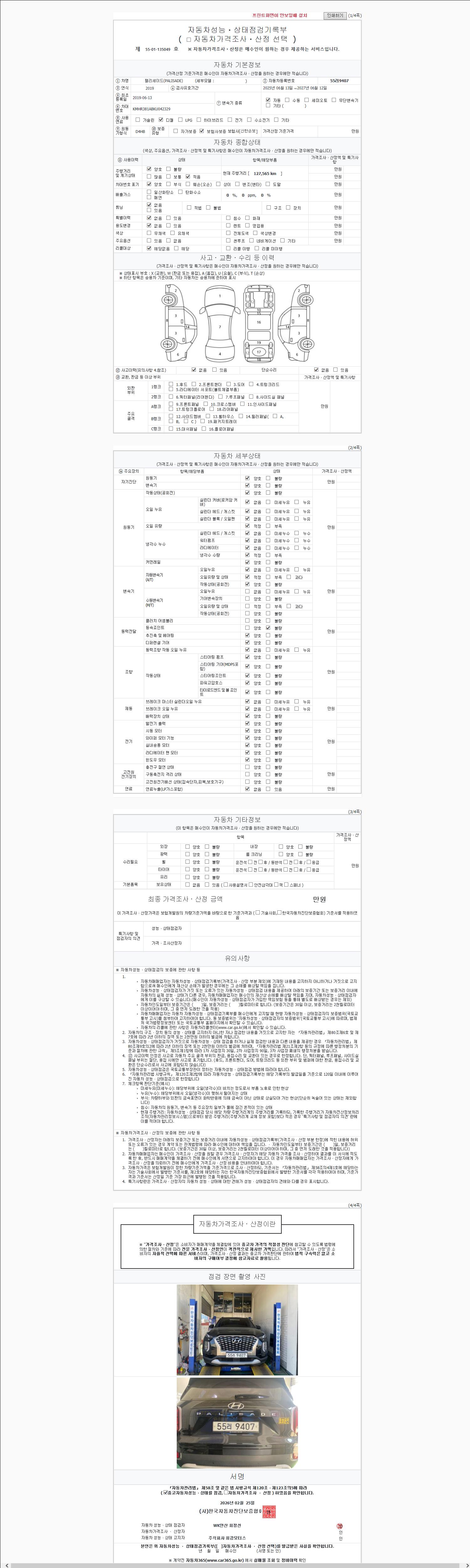 | 주행거리 | 127,565 km | 차량번호 | 55러9407 | 사고유무 | 성능기록부 참조 | 제시번호 | 제 2147483647 호 |