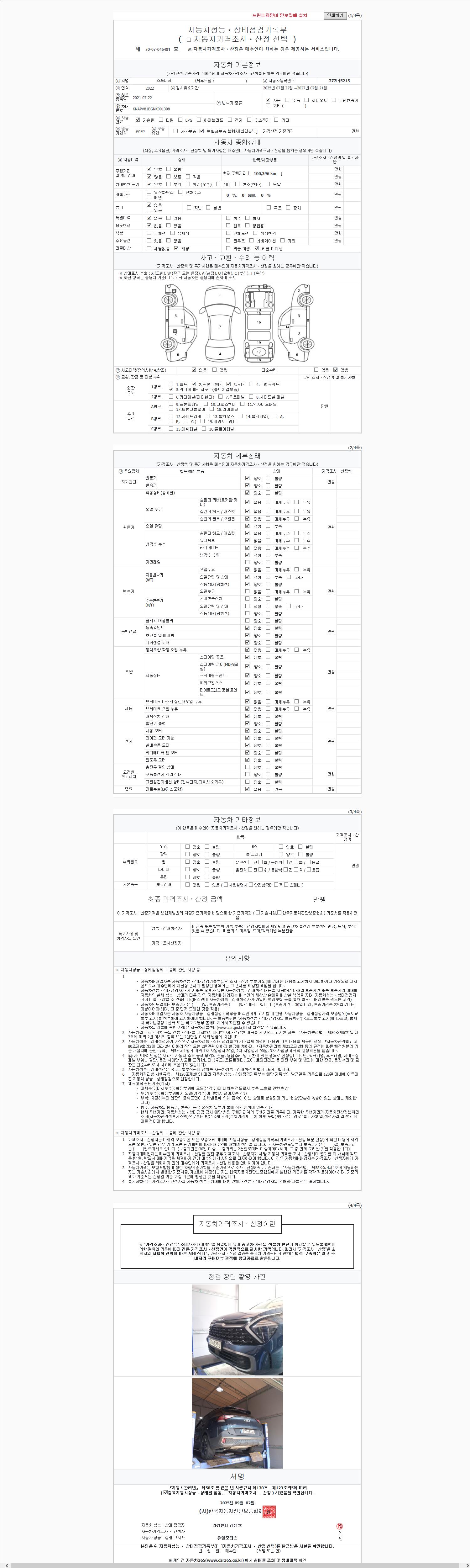 자동차관리법 시행규칙 제120조의 규정에 따라 별지 제 82호서식 《중고자동차 성능, 상태점검 기록부》를 발행한 성능, 상태점검자 및 매매자는 아래의 보증기간 또는 보증거리 이내의 중고자동차, 성능점검 기록부에 기재된 내용과 자동차의 실제 성능, 상태가 다른 경우 계약 또는 관계법령에 따라 매수인에 대하여 책임을 집니다.