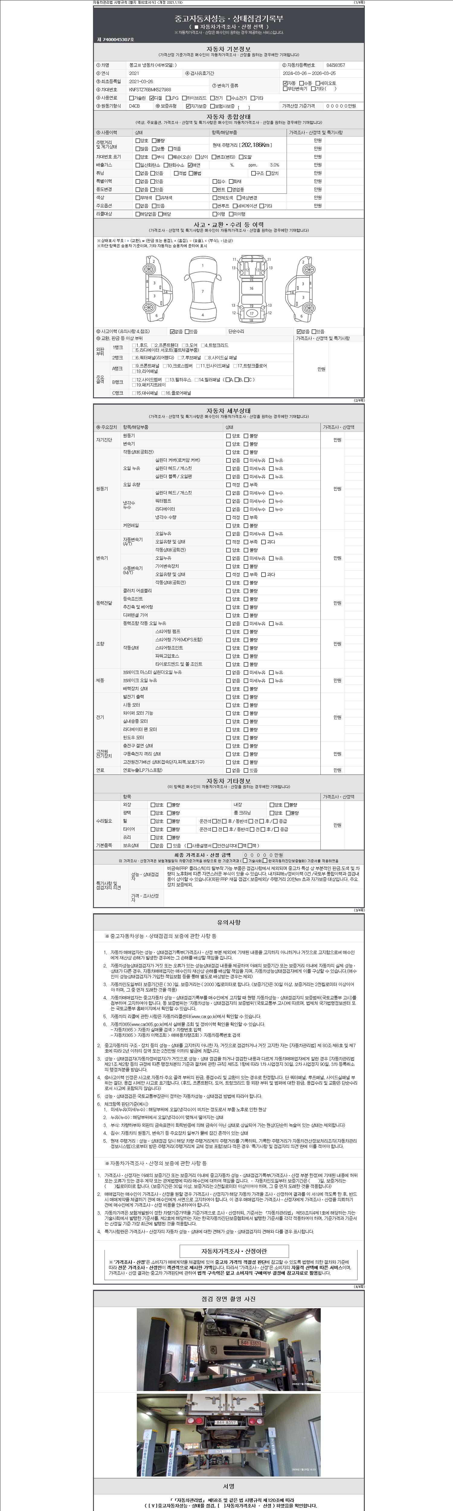 -중고자동차 매매업자를 통해 차량을 구입하실 경우 반드시 "중고자동차 성능, 상태점검 기록부"를 교뷰 받으셔야 하며, 매매업자는 반드시 의무 교부 하여야 압니다.