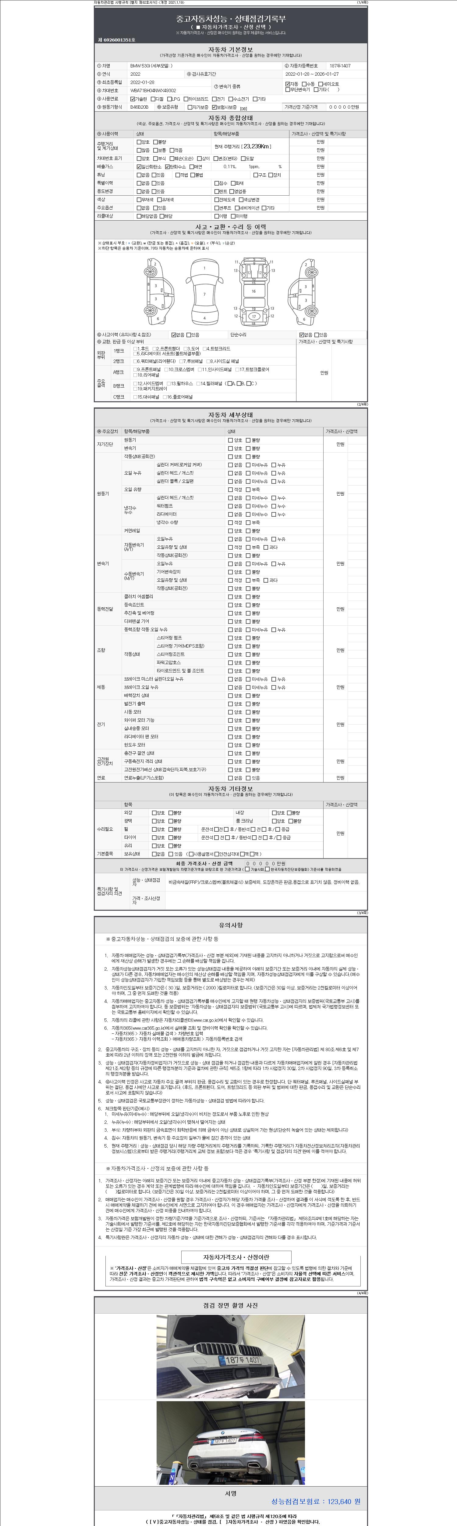 자동차관리법 시행규칙 제120조의 규정에 따라 별지 제 82호서식 《중고자동차 성능, 상태점검 기록부》를 발행한 성능, 상태점검자 및 매매자는 아래의 보증기간 또는 보증거리 이내의 중고자동차, 성능점검 기록부에 기재된 내용과 자동차의 실제 성능, 상태가 다른 경우 계약 또는 관계법령에 따라 매수인에 대하여 책임을 집니다.