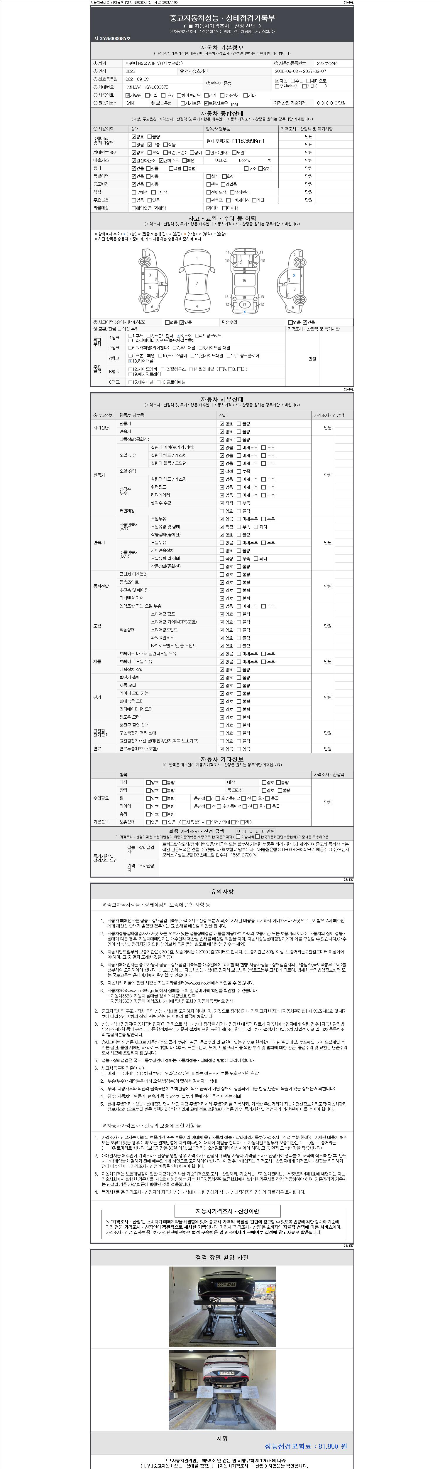 자동차관리법 시행규칙 제120조의 규정에 따라 별지 제 82호서식 《중고자동차 성능, 상태점검 기록부》를 발행한 성능, 상태점검자 및 매매자는 아래의 보증기간 또는 보증거리 이내의 중고자동차, 성능점검 기록부에 기재된 내용과 자동차의 실제 성능, 상태가 다른 경우 계약 또는 관계법령에 따라 매수인에 대하여 책임을 집니다.