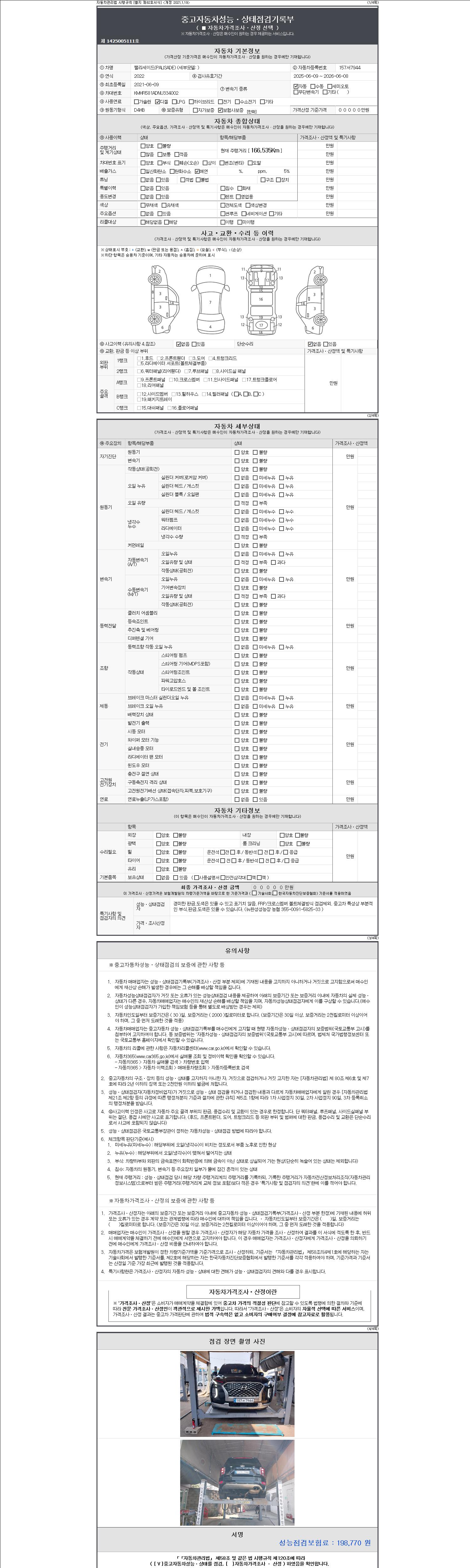 자동차관리법 시행규칙 제120조의 규정에 따라 별지 제 82호서식 《중고자동차 성능, 상태점검 기록부》를 발행한 성능, 상태점검자 및 매매자는 아래의 보증기간 또는 보증거리 이내의 중고자동차, 성능점검 기록부에 기재된 내용과 자동차의 실제 성능, 상태가 다른 경우 계약 또는 관계법령에 따라 매수인에 대하여 책임을 집니다.