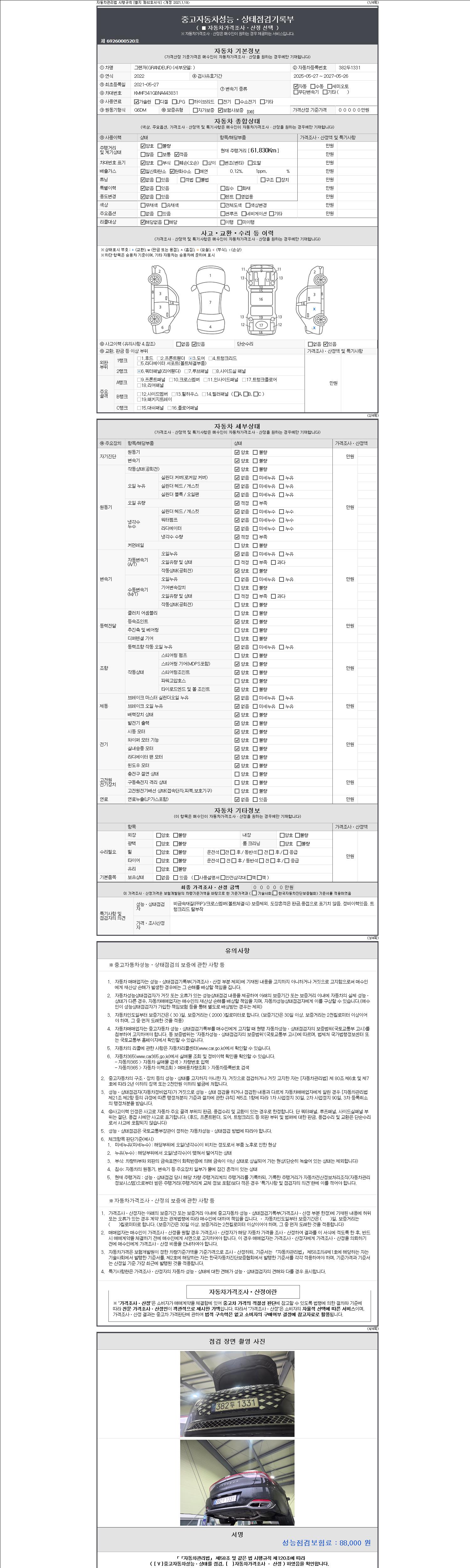 자동차관리법 시행규칙 제120조의 규정에 따라 별지 제 82호서식 《중고자동차 성능, 상태점검 기록부》를 발행한 성능, 상태점검자 및 매매자는 아래의 보증기간 또는 보증거리 이내의 중고자동차, 성능점검 기록부에 기재된 내용과 자동차의 실제 성능, 상태가 다른 경우 계약 또는 관계법령에 따라 매수인에 대하여 책임을 집니다.