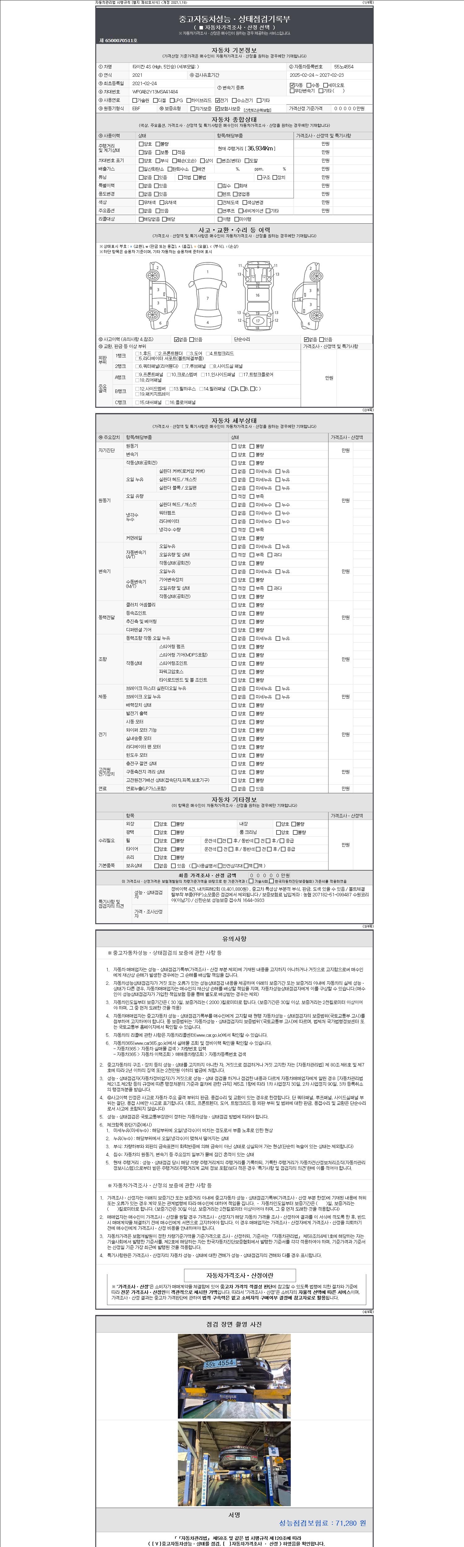 -중고자동차 매매업자를 통해 차량을 구입하실 경우 반드시 "중고자동차 성능, 상태점검 기록부"를 교뷰 받으셔야 하며, 매매업자는 반드시 의무 교부 하여야 압니다.