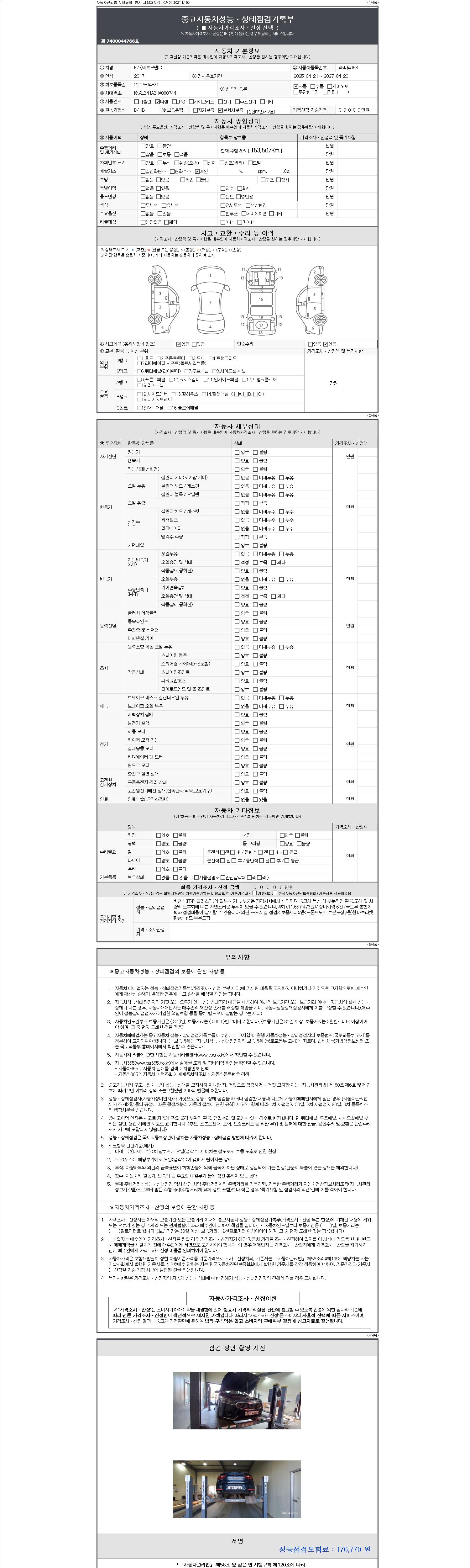 자동차관리법 시행규칙 제120조의 규정에 따라 별지 제 82호서식 《중고자동차 성능, 상태점검 기록부》를 발행한 성능, 상태점검자 및 매매자는 아래의 보증기간 또는 보증거리 이내의 중고자동차, 성능점검 기록부에 기재된 내용과 자동차의 실제 성능, 상태가 다른 경우 계약 또는 관계법령에 따라 매수인에 대하여 책임을 집니다.