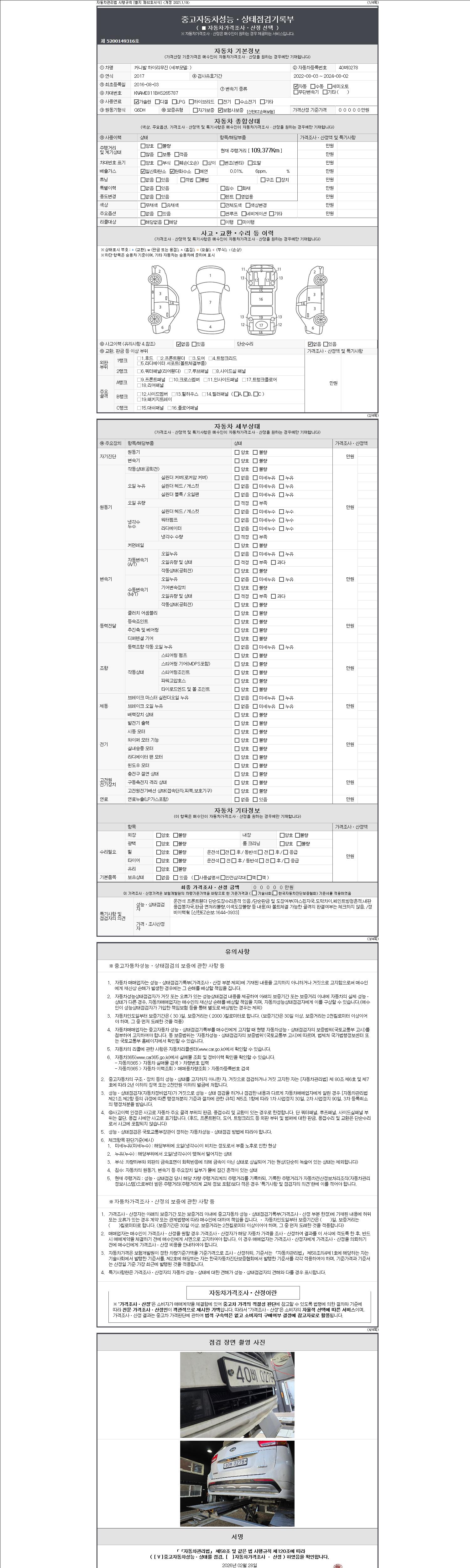 자동차관리법 시행규칙 제120조의 규정에 따라 별지 제 82호서식 《중고자동차 성능, 상태점검 기록부》를 발행한 성능, 상태점검자 및 매매자는 아래의 보증기간 또는 보증거리 이내의 중고자동차, 성능점검 기록부에 기재된 내용과 자동차의 실제 성능, 상태가 다른 경우 계약 또는 관계법령에 따라 매수인에 대하여 책임을 집니다.