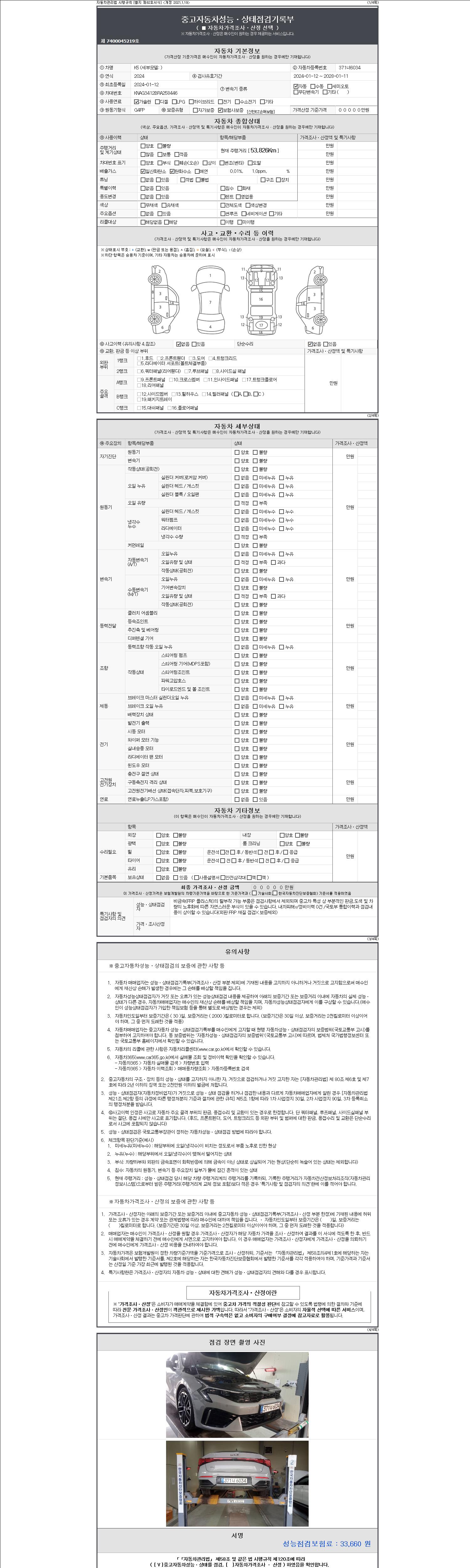 자동차관리법 시행규칙 제120조의 규정에 따라 별지 제 82호서식 《중고자동차 성능, 상태점검 기록부》를 발행한 성능, 상태점검자 및 매매자는 아래의 보증기간 또는 보증거리 이내의 중고자동차, 성능점검 기록부에 기재된 내용과 자동차의 실제 성능, 상태가 다른 경우 계약 또는 관계법령에 따라 매수인에 대하여 책임을 집니다.