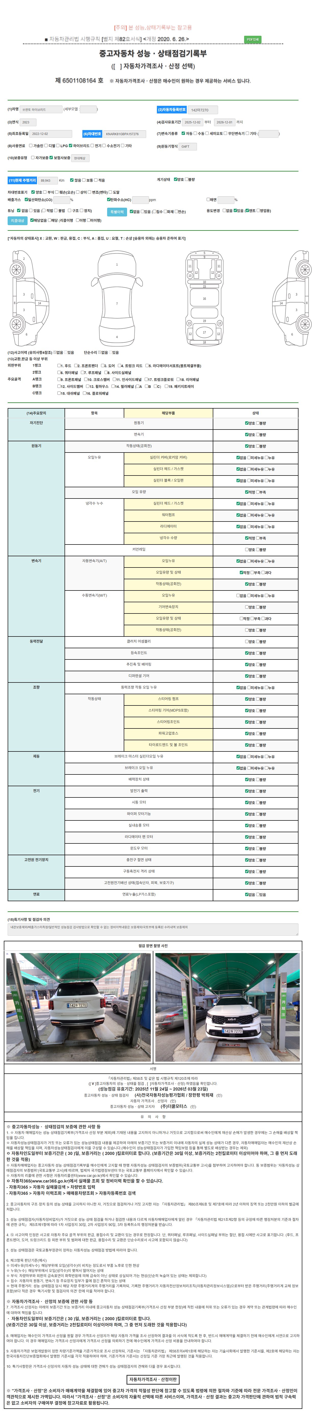 자동차관리법 시행규칙 제120조의 규정에 따라 별지 제 82호서식 《중고자동차 성능, 상태점검 기록부》를 발행한 성능, 상태점검자 및 매매자는 아래의 보증기간 또는 보증거리 이내의 중고자동차, 성능점검 기록부에 기재된 내용과 자동차의 실제 성능, 상태가 다른 경우 계약 또는 관계법령에 따라 매수인에 대하여 책임을 집니다.