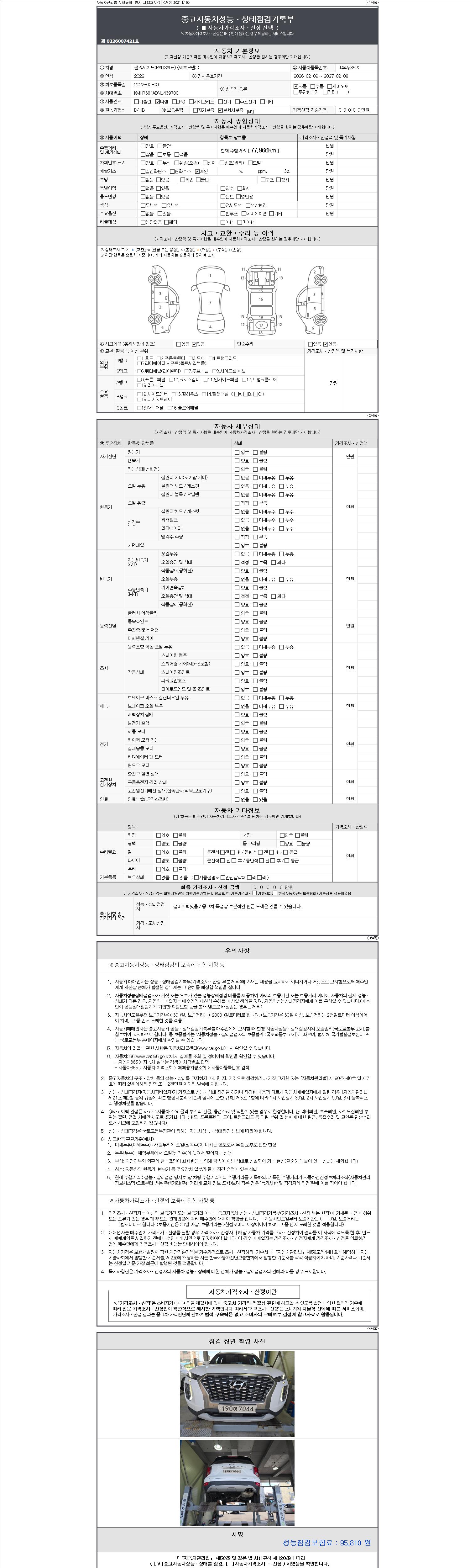 자동차관리법 시행규칙 제120조의 규정에 따라 별지 제 82호서식 《중고자동차 성능, 상태점검 기록부》를 발행한 성능, 상태점검자 및 매매자는 아래의 보증기간 또는 보증거리 이내의 중고자동차, 성능점검 기록부에 기재된 내용과 자동차의 실제 성능, 상태가 다른 경우 계약 또는 관계법령에 따라 매수인에 대하여 책임을 집니다.