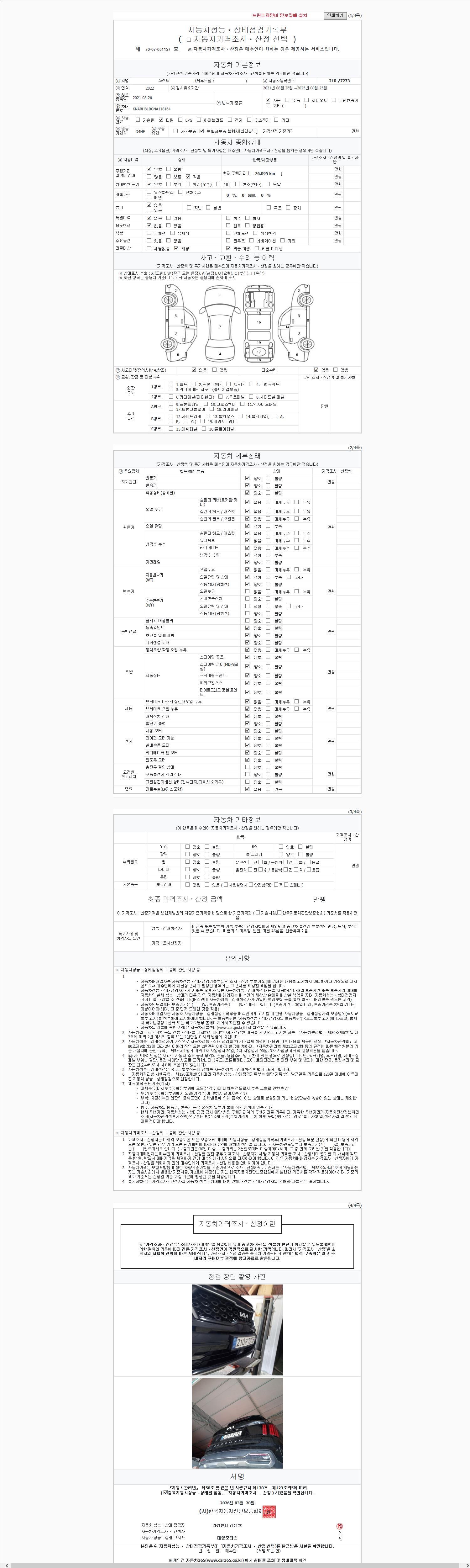 자동차관리법 시행규칙 제120조의 규정에 따라 별지 제 82호서식 《중고자동차 성능, 상태점검 기록부》를 발행한 성능, 상태점검자 및 매매자는 아래의 보증기간 또는 보증거리 이내의 중고자동차, 성능점검 기록부에 기재된 내용과 자동차의 실제 성능, 상태가 다른 경우 계약 또는 관계법령에 따라 매수인에 대하여 책임을 집니다.