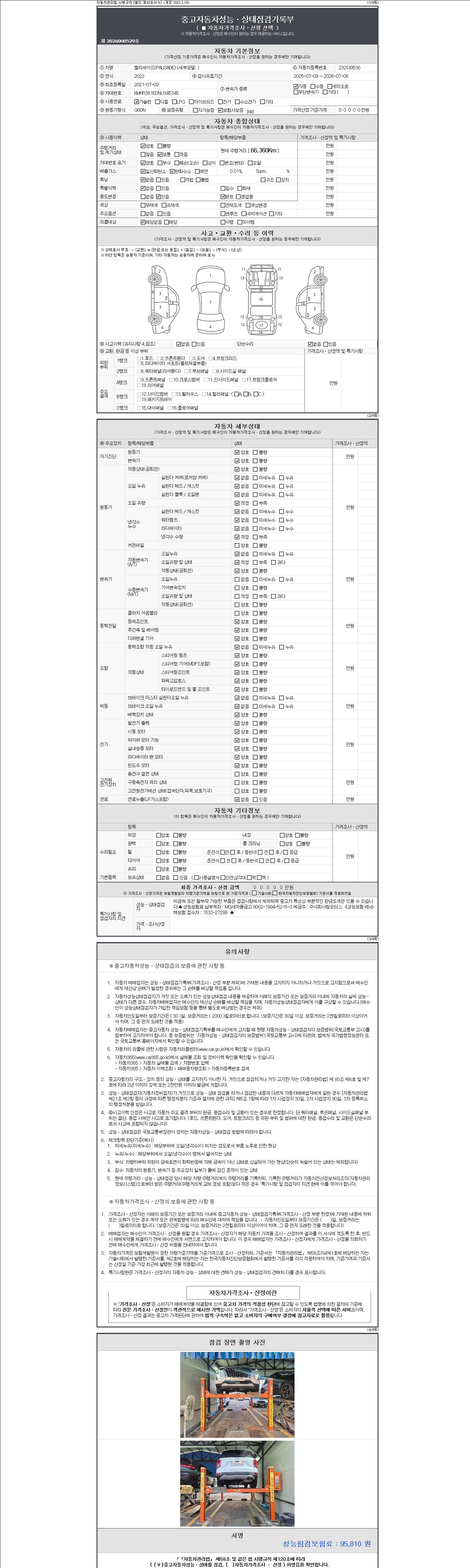 자동차관리법 시행규칙 제120조의 규정에 따라 별지 제 82호서식 《중고자동차 성능, 상태점검 기록부》를 발행한 성능, 상태점검자 및 매매자는 아래의 보증기간 또는 보증거리 이내의 중고자동차, 성능점검 기록부에 기재된 내용과 자동차의 실제 성능, 상태가 다른 경우 계약 또는 관계법령에 따라 매수인에 대하여 책임을 집니다.