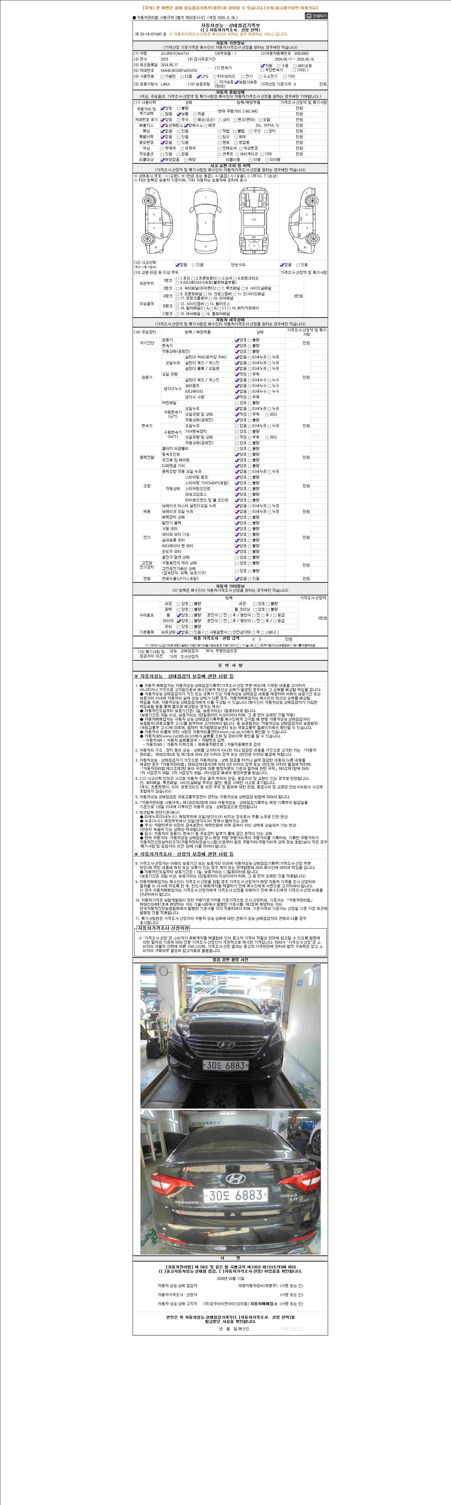 자동차관리법 시행규칙 제120조의 규정에 따라 별지 제 82호서식 《중고자동차 성능, 상태점검 기록부》를 발행한 성능, 상태점검자 및 매매자는 아래의 보증기간 또는 보증거리 이내의 중고자동차, 성능점검 기록부에 기재된 내용과 자동차의 실제 성능, 상태가 다른 경우 계약 또는 관계법령에 따라 매수인에 대하여 책임을 집니다.