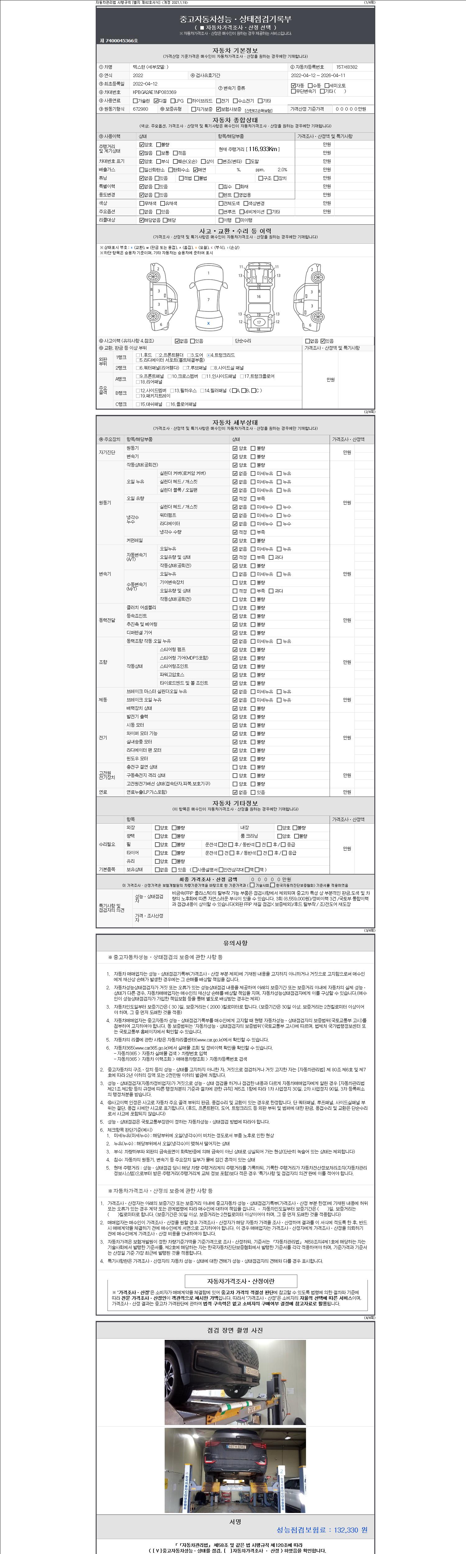 자동차관리법 시행규칙 제120조의 규정에 따라 별지 제 82호서식 《중고자동차 성능, 상태점검 기록부》를 발행한 성능, 상태점검자 및 매매자는 아래의 보증기간 또는 보증거리 이내의 중고자동차, 성능점검 기록부에 기재된 내용과 자동차의 실제 성능, 상태가 다른 경우 계약 또는 관계법령에 따라 매수인에 대하여 책임을 집니다.