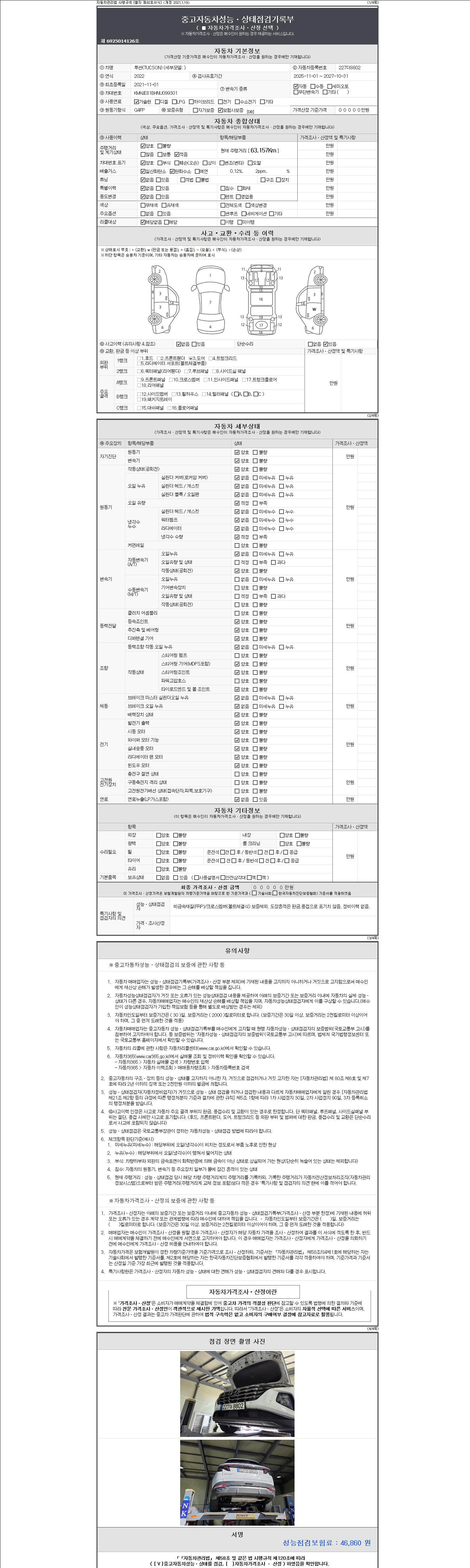 자동차관리법 시행규칙 제120조의 규정에 따라 별지 제 82호서식 《중고자동차 성능, 상태점검 기록부》를 발행한 성능, 상태점검자 및 매매자는 아래의 보증기간 또는 보증거리 이내의 중고자동차, 성능점검 기록부에 기재된 내용과 자동차의 실제 성능, 상태가 다른 경우 계약 또는 관계법령에 따라 매수인에 대하여 책임을 집니다.