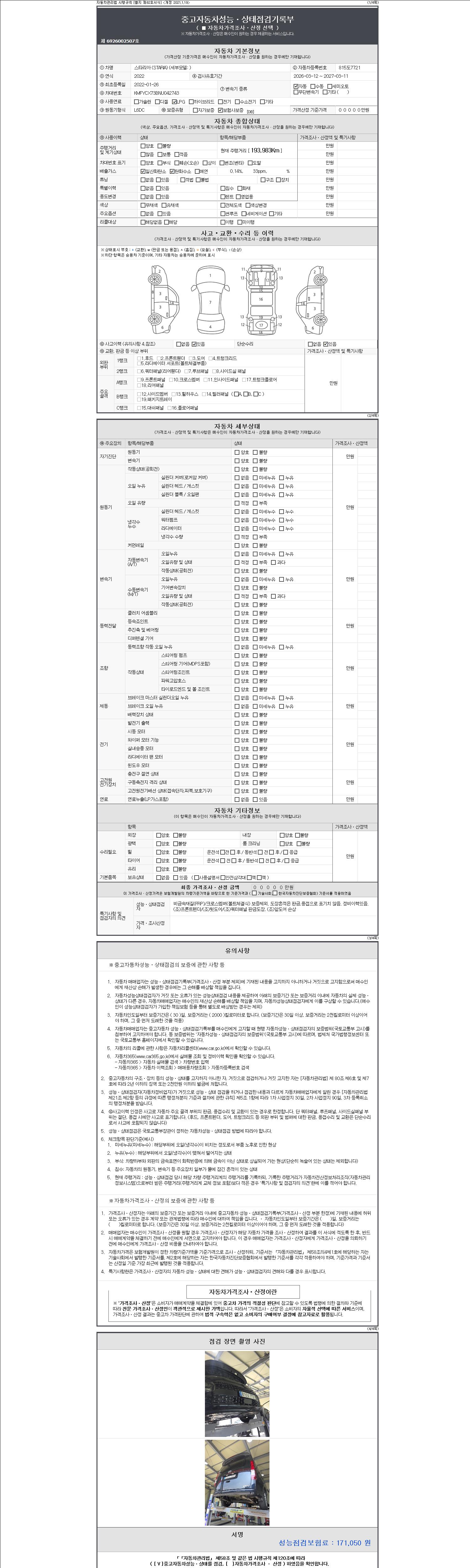 자동차관리법 시행규칙 제120조의 규정에 따라 별지 제 82호서식 《중고자동차 성능, 상태점검 기록부》를 발행한 성능, 상태점검자 및 매매자는 아래의 보증기간 또는 보증거리 이내의 중고자동차, 성능점검 기록부에 기재된 내용과 자동차의 실제 성능, 상태가 다른 경우 계약 또는 관계법령에 따라 매수인에 대하여 책임을 집니다.