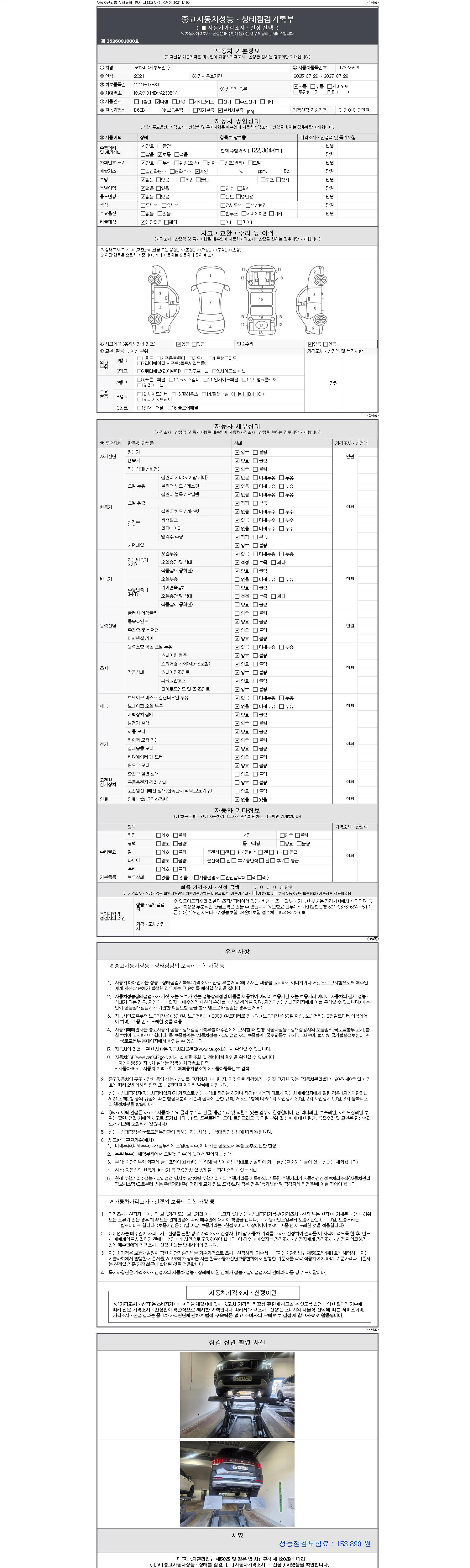 자동차관리법 시행규칙 제120조의 규정에 따라 별지 제 82호서식 《중고자동차 성능, 상태점검 기록부》를 발행한 성능, 상태점검자 및 매매자는 아래의 보증기간 또는 보증거리 이내의 중고자동차, 성능점검 기록부에 기재된 내용과 자동차의 실제 성능, 상태가 다른 경우 계약 또는 관계법령에 따라 매수인에 대하여 책임을 집니다.