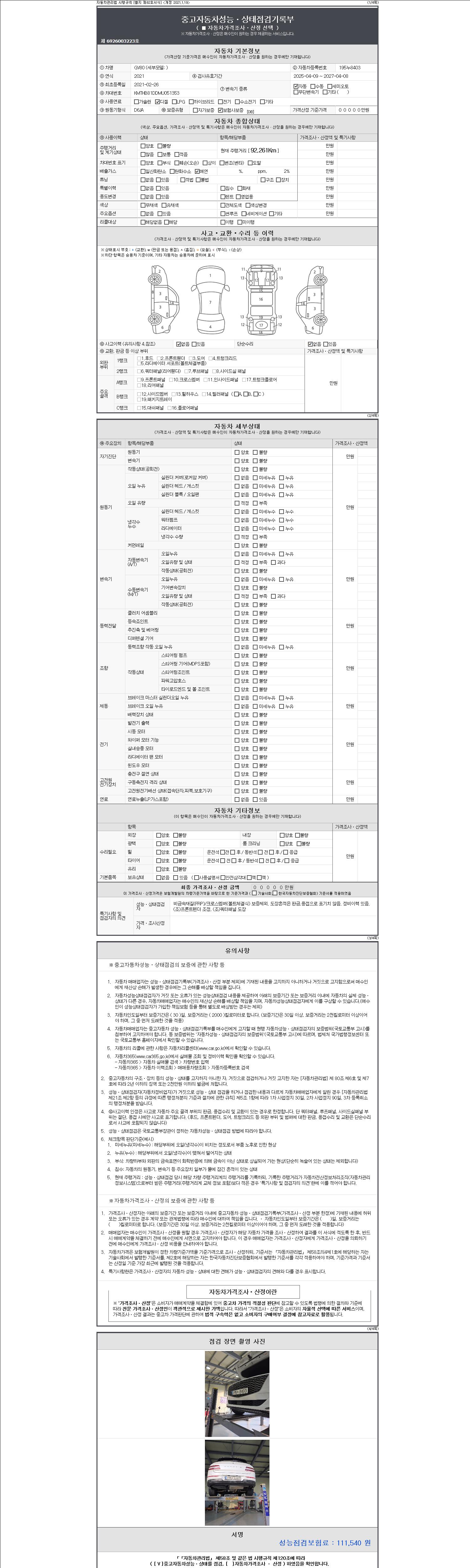 자동차관리법 시행규칙 제120조의 규정에 따라 별지 제 82호서식 《중고자동차 성능, 상태점검 기록부》를 발행한 성능, 상태점검자 및 매매자는 아래의 보증기간 또는 보증거리 이내의 중고자동차, 성능점검 기록부에 기재된 내용과 자동차의 실제 성능, 상태가 다른 경우 계약 또는 관계법령에 따라 매수인에 대하여 책임을 집니다.