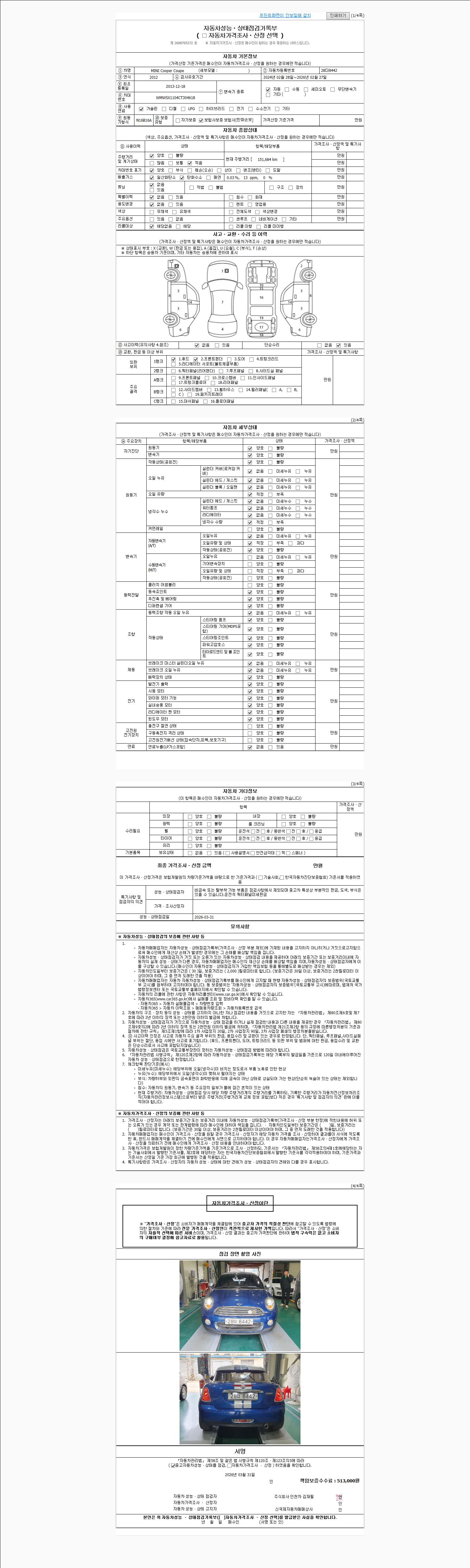 -중고자동차 매매업자를 통해 차량을 구입하실 경우 반드시 "중고자동차 성능, 상태점검 기록부"를 교뷰 받으셔야 하며, 매매업자는 반드시 의무 교부 하여야 압니다.