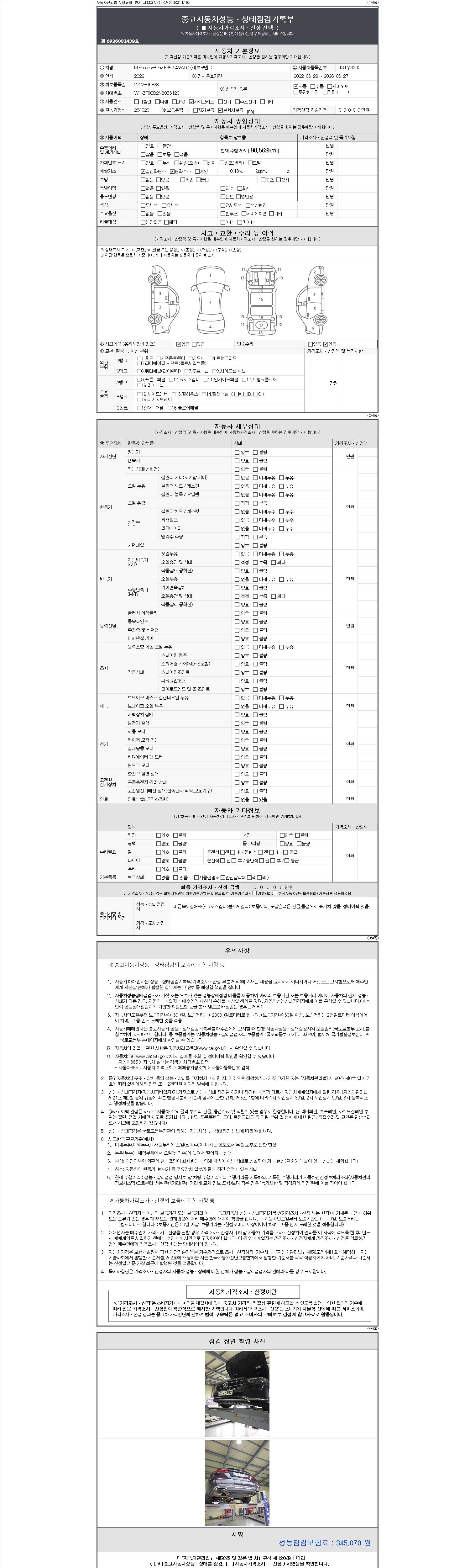 자동차관리법 시행규칙 제120조의 규정에 따라 별지 제 82호서식 《중고자동차 성능, 상태점검 기록부》를 발행한 성능, 상태점검자 및 매매자는 아래의 보증기간 또는 보증거리 이내의 중고자동차, 성능점검 기록부에 기재된 내용과 자동차의 실제 성능, 상태가 다른 경우 계약 또는 관계법령에 따라 매수인에 대하여 책임을 집니다.