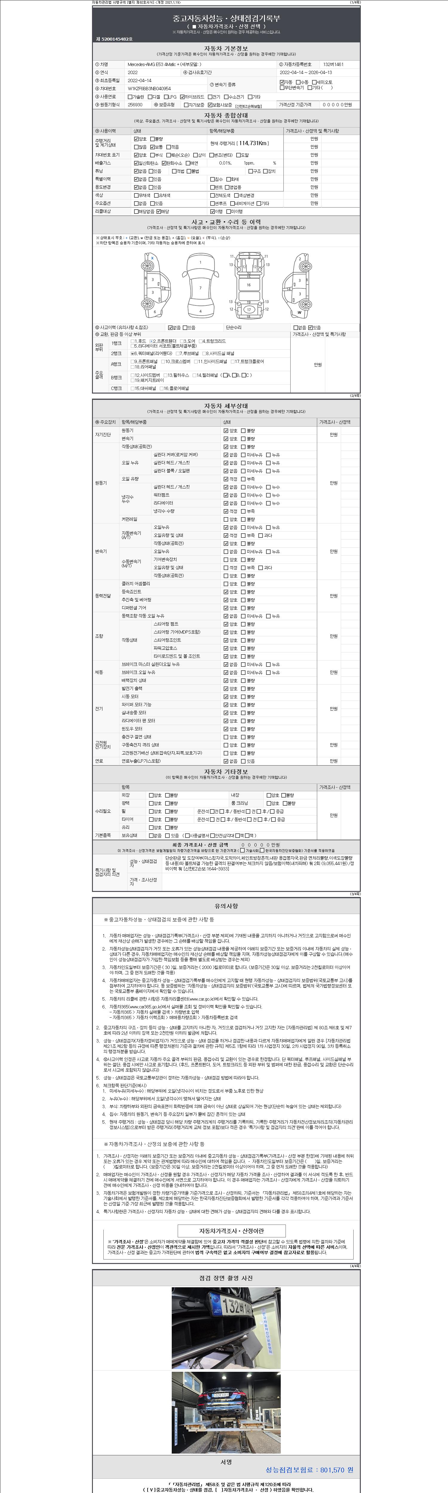 자동차관리법 시행규칙 제120조의 규정에 따라 별지 제 82호서식 《중고자동차 성능, 상태점검 기록부》를 발행한 성능, 상태점검자 및 매매자는 아래의 보증기간 또는 보증거리 이내의 중고자동차, 성능점검 기록부에 기재된 내용과 자동차의 실제 성능, 상태가 다른 경우 계약 또는 관계법령에 따라 매수인에 대하여 책임을 집니다.