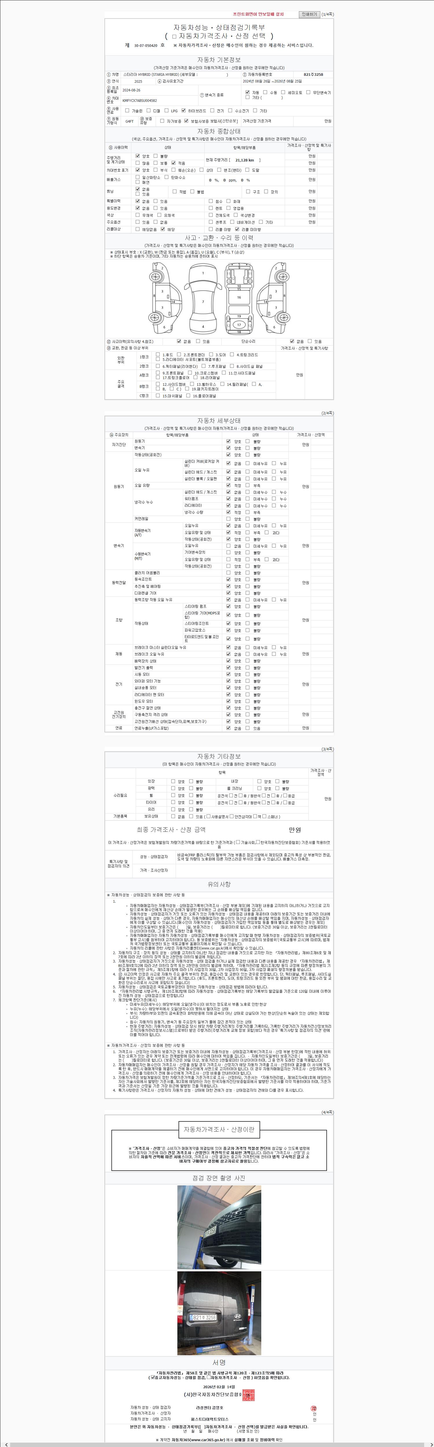 자동차관리법 시행규칙 제120조의 규정에 따라 별지 제 82호서식 《중고자동차 성능, 상태점검 기록부》를 발행한 성능, 상태점검자 및 매매자는 아래의 보증기간 또는 보증거리 이내의 중고자동차, 성능점검 기록부에 기재된 내용과 자동차의 실제 성능, 상태가 다른 경우 계약 또는 관계법령에 따라 매수인에 대하여 책임을 집니다.
