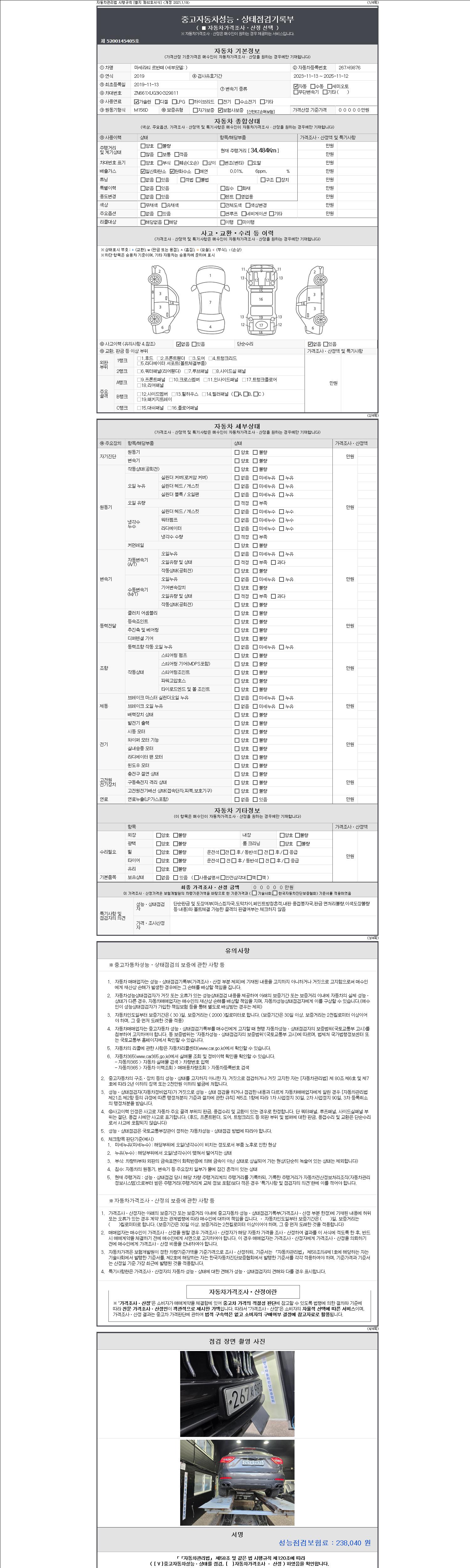 자동차관리법 시행규칙 제120조의 규정에 따라 별지 제 82호서식 《중고자동차 성능, 상태점검 기록부》를 발행한 성능, 상태점검자 및 매매자는 아래의 보증기간 또는 보증거리 이내의 중고자동차, 성능점검 기록부에 기재된 내용과 자동차의 실제 성능, 상태가 다른 경우 계약 또는 관계법령에 따라 매수인에 대하여 책임을 집니다.
