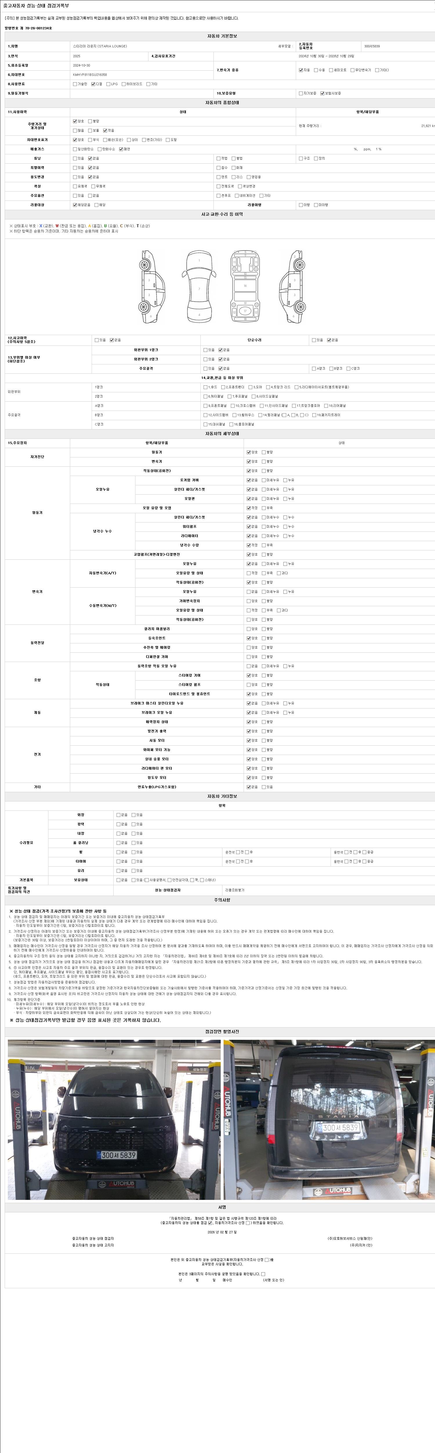 자동차관리법 시행규칙 제120조의 규정에 따라 별지 제 82호서식 《중고자동차 성능, 상태점검 기록부》를 발행한 성능, 상태점검자 및 매매자는 아래의 보증기간 또는 보증거리 이내의 중고자동차, 성능점검 기록부에 기재된 내용과 자동차의 실제 성능, 상태가 다른 경우 계약 또는 관계법령에 따라 매수인에 대하여 책임을 집니다.