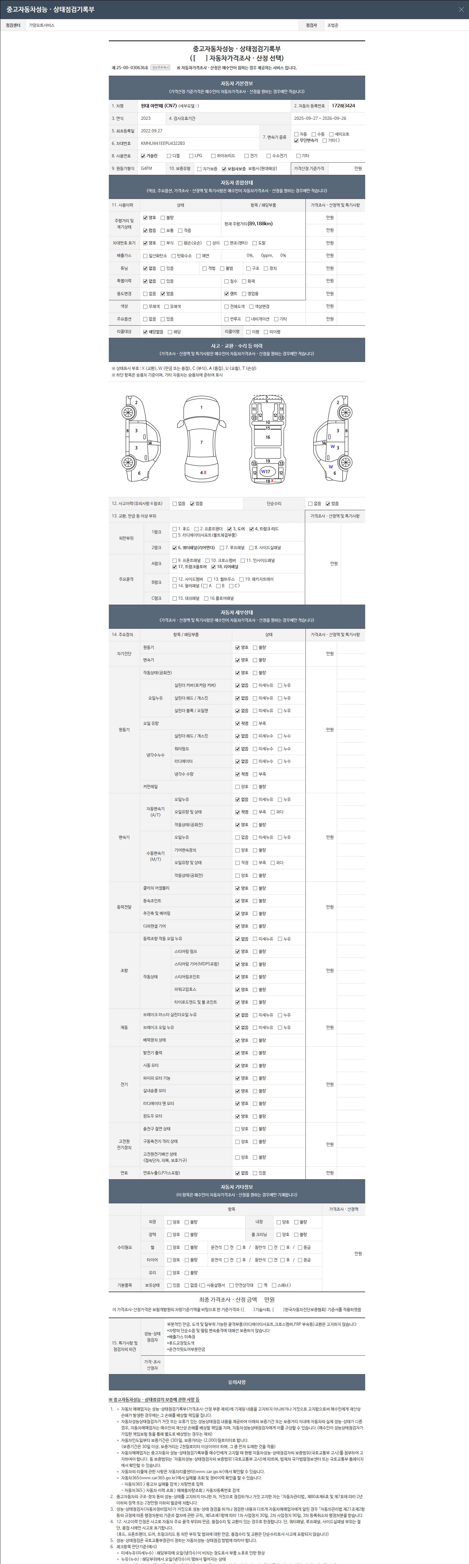 2. 차량 등록증이나 성능점검지 등을 상담자에게 요청및 확인하시고 사전에 미리 점검 하시기를 권유드립니다.