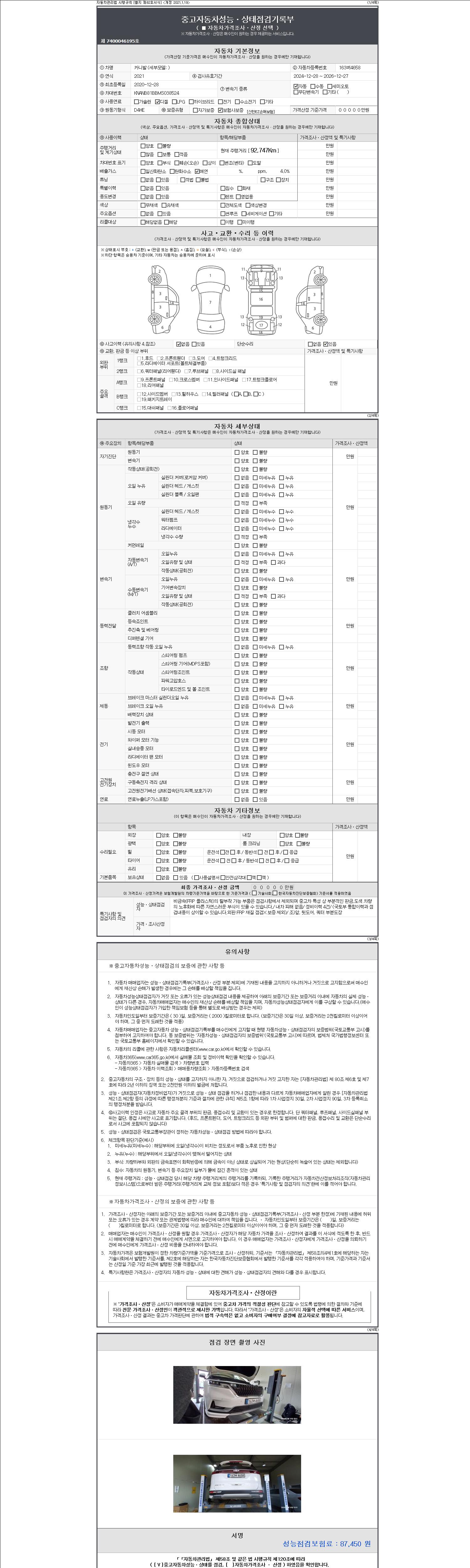 자동차관리법 시행규칙 제120조의 규정에 따라 별지 제 82호서식 《중고자동차 성능, 상태점검 기록부》를 발행한 성능, 상태점검자 및 매매자는 아래의 보증기간 또는 보증거리 이내의 중고자동차, 성능점검 기록부에 기재된 내용과 자동차의 실제 성능, 상태가 다른 경우 계약 또는 관계법령에 따라 매수인에 대하여 책임을 집니다.