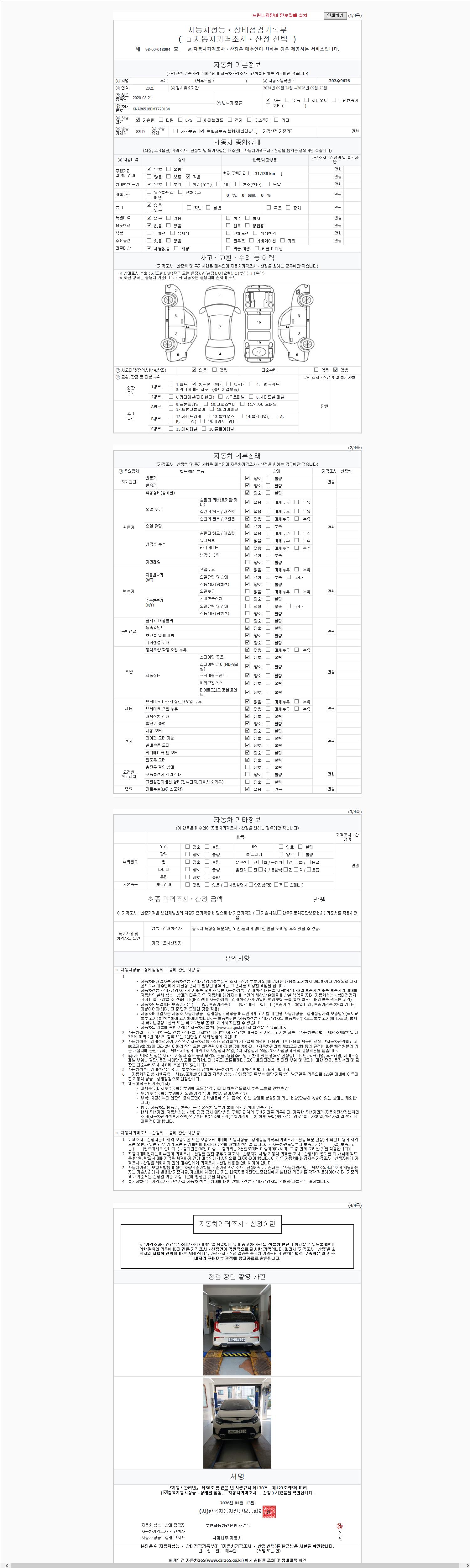 | 주행거리 | 31,164 km | 차량번호 | 302수9626 | 사고유무 | 성능기록부 참조 | 제시번호 | 제 2026070169 호 |