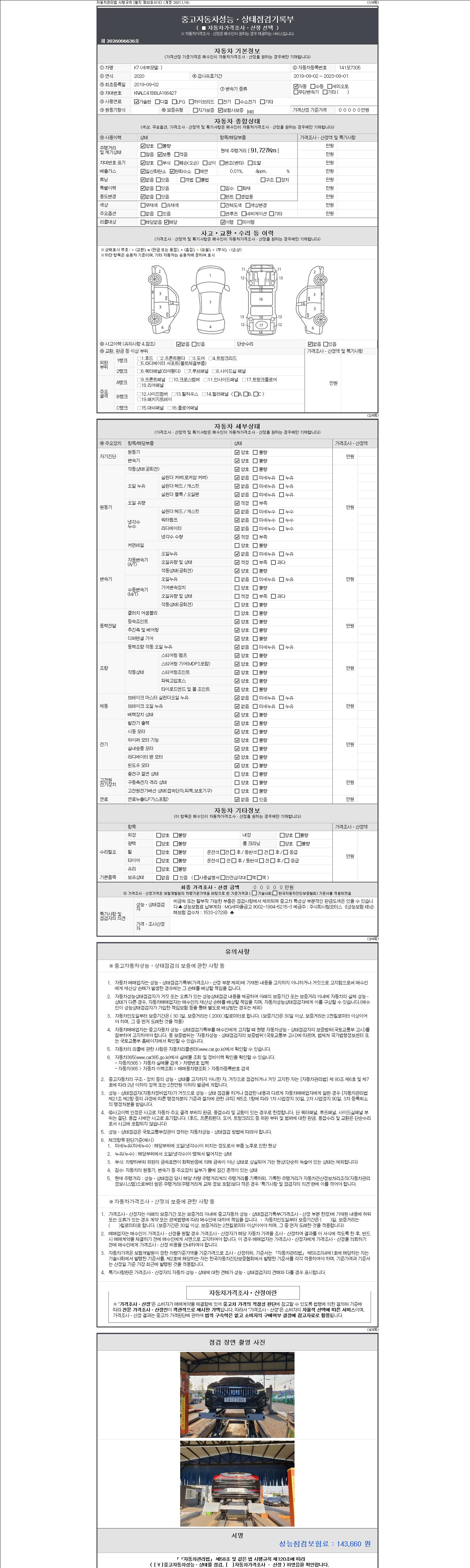 자동차관리법 시행규칙 제120조의 규정에 따라 별지 제 82호서식 《중고자동차 성능, 상태점검 기록부》를 발행한 성능, 상태점검자 및 매매자는 아래의 보증기간 또는 보증거리 이내의 중고자동차, 성능점검 기록부에 기재된 내용과 자동차의 실제 성능, 상태가 다른 경우 계약 또는 관계법령에 따라 매수인에 대하여 책임을 집니다.