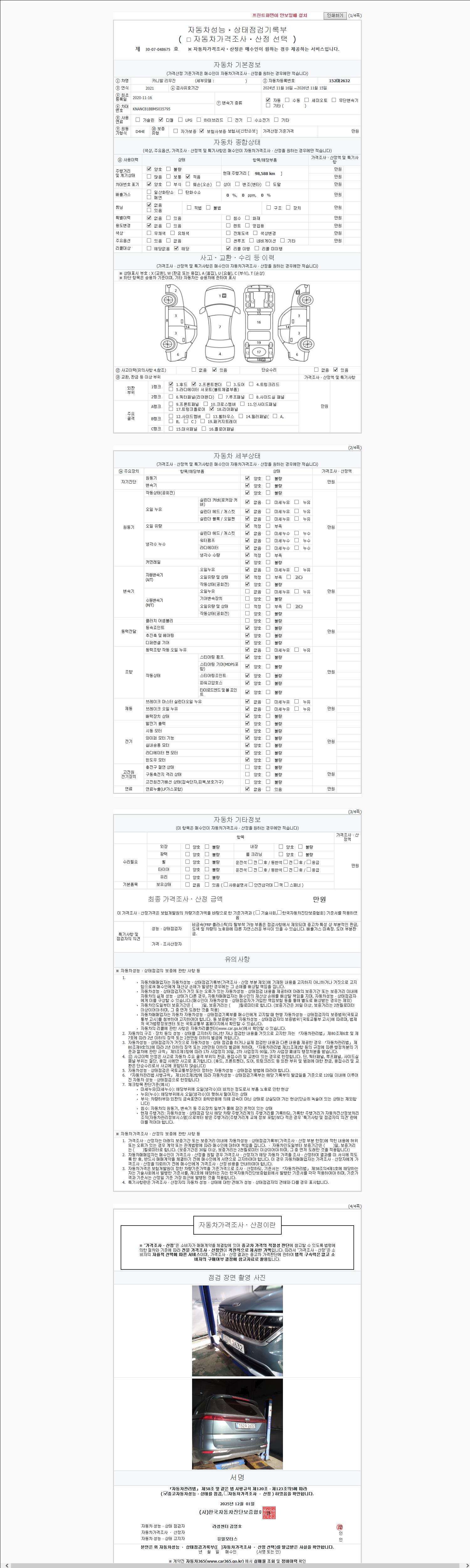 -중고자동차 매매업자를 통해 차량을 구입하실 경우 반드시 "중고자동차 성능, 상태점검 기록부"를 교뷰 받으셔야 하며, 매매업자는 반드시 의무 교부 하여야 압니다.