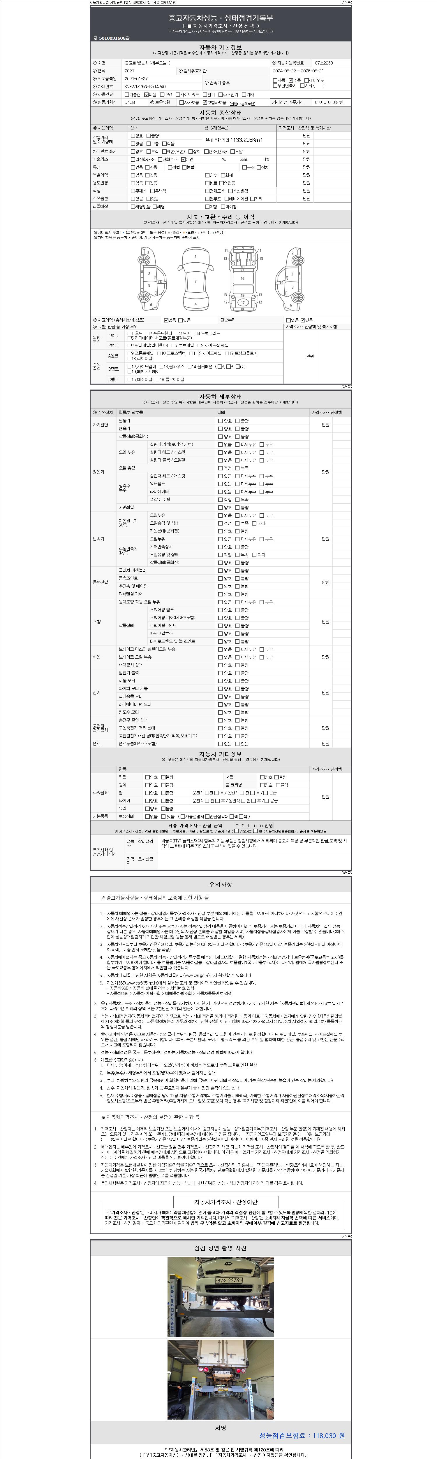 | 주행거리 | 133,176 km | 차량번호 | 87소2239 | 사고유무 | 성능기록부 참조 | 제시번호 | 제 2147483647 호 |