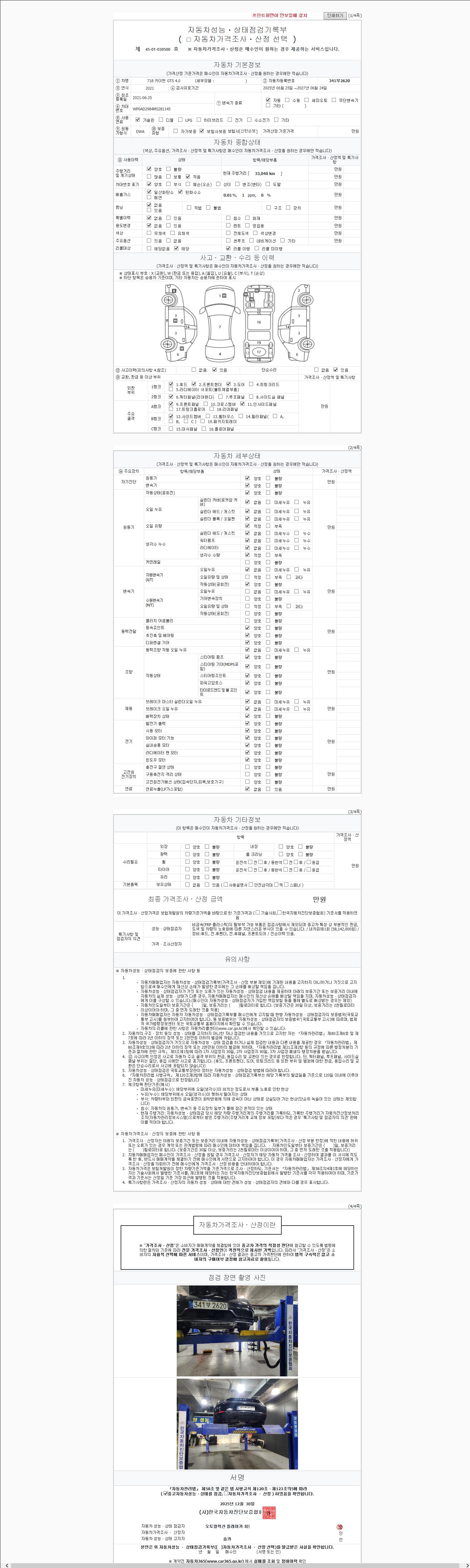 | 주행거리 | 33,040 km | 차량번호 | 341부2620 | 사고유무 | 성능기록부 참조 | 제시번호 | 제 2147483647 호 |