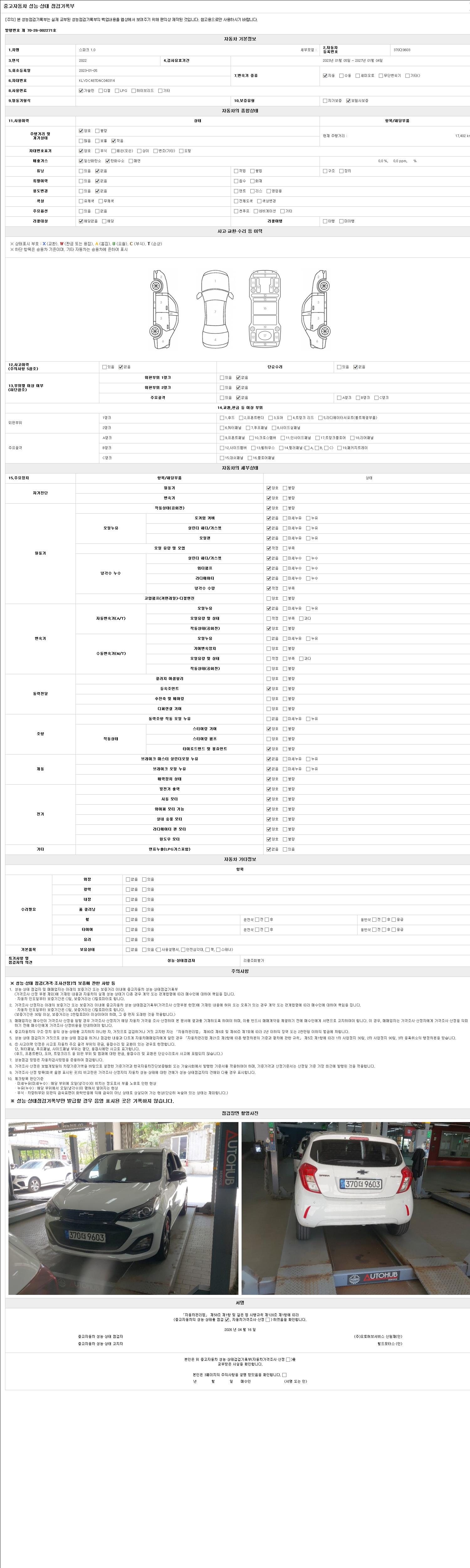 자동차관리법 시행규칙 제120조의 규정에 따라 별지 제 82호서식 《중고자동차 성능, 상태점검 기록부》를 발행한 성능, 상태점검자 및 매매자는 아래의 보증기간 또는 보증거리 이내의 중고자동차, 성능점검 기록부에 기재된 내용과 자동차의 실제 성능, 상태가 다른 경우 계약 또는 관계법령에 따라 매수인에 대하여 책임을 집니다.